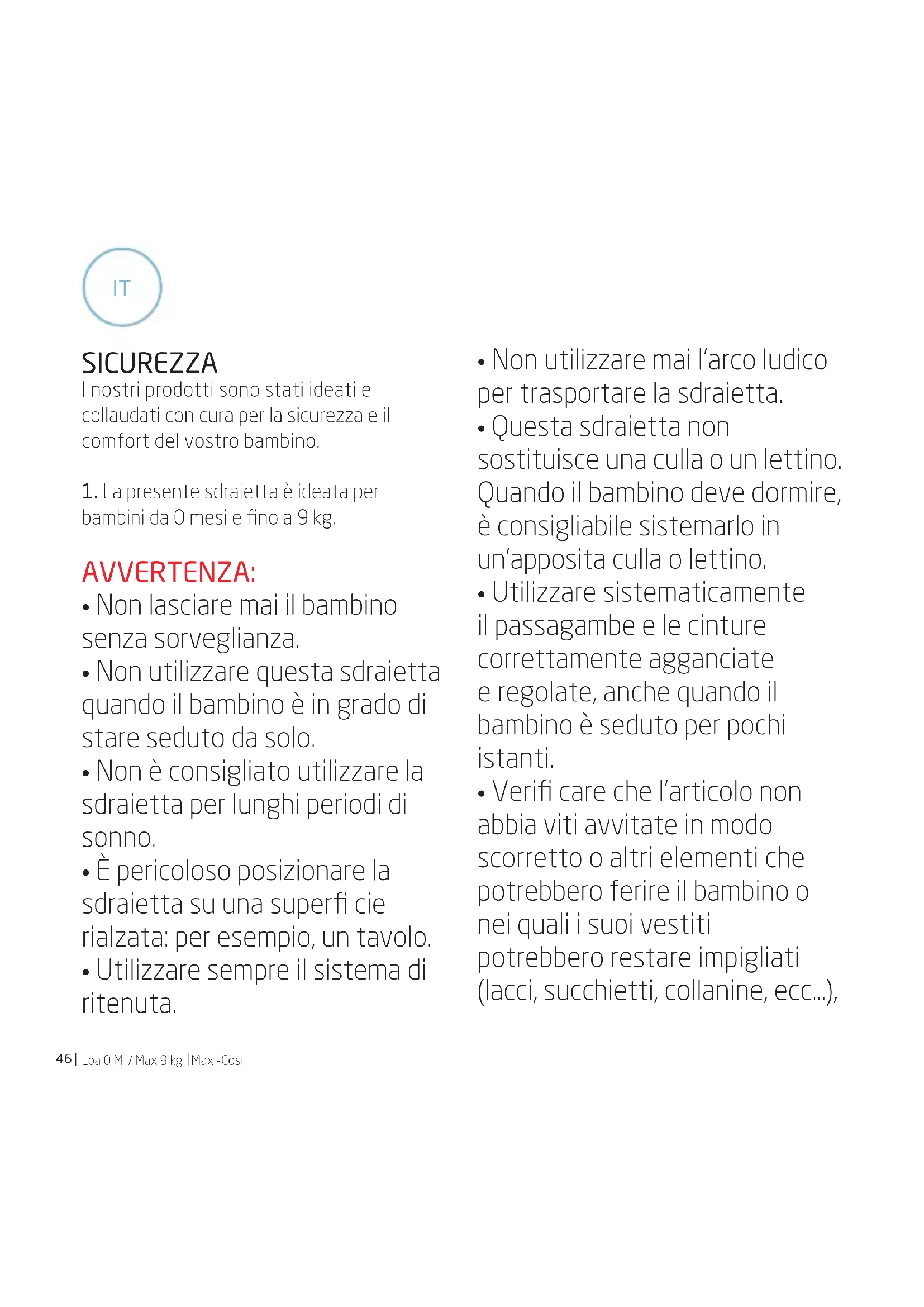 - Verifi care che l’articolo non abbia viti avvitate in modo scorretto o altri elementi che potrebbero ferire il bambino o nei quali i suoi vestiti potrebbero restare impigliati (lacci, succhietti, collanine, ecc…), ITMaxi-Cosi