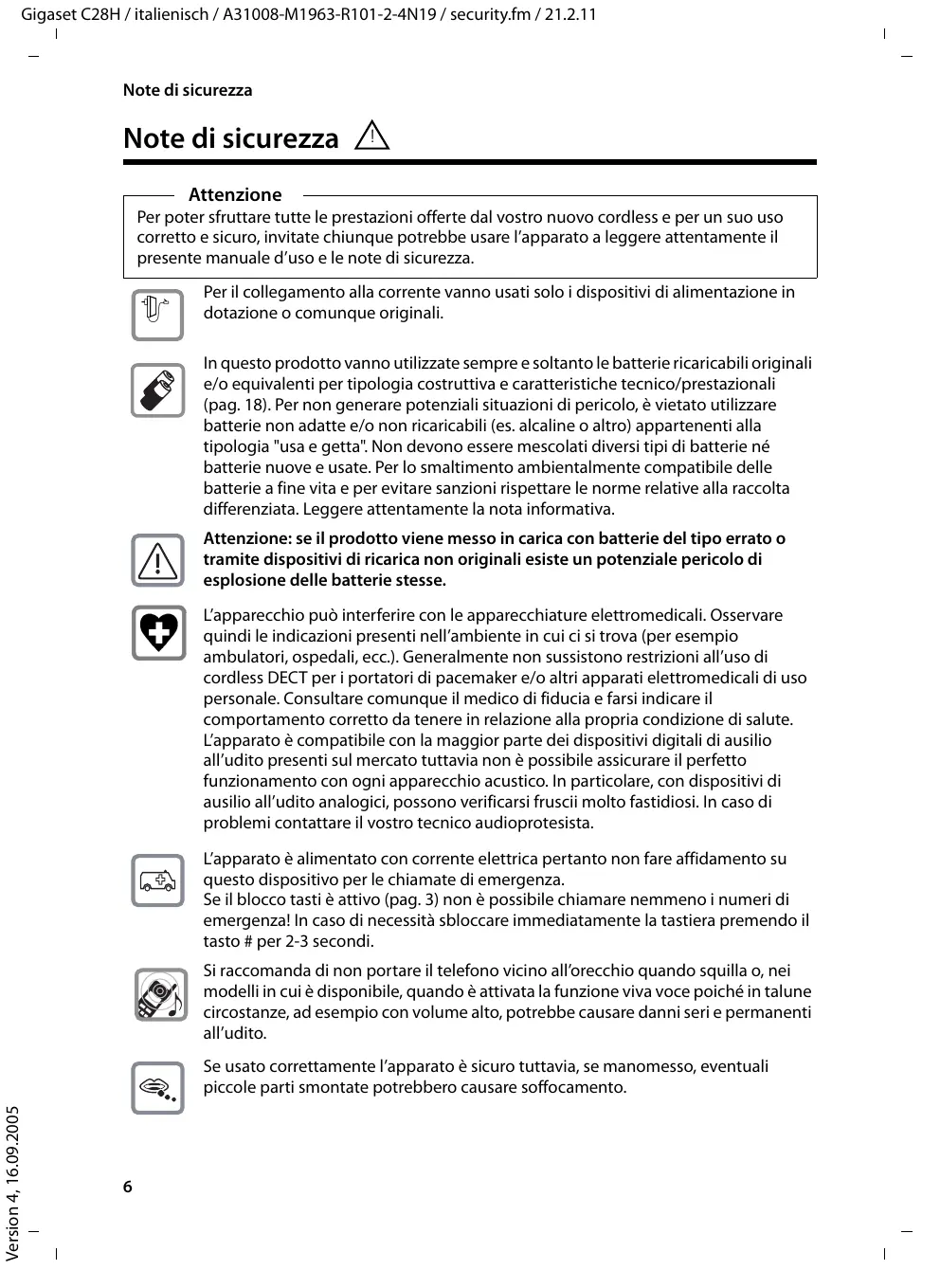 Per il collegamento alla corrente vanno usati solo i dispositivi di alimentazione in dotazione o comunque originali. In questo prodotto vanno utilizzate sempre e soltanto le batterie ricaricabili originali e/o equivalenti per tipologia costruttiva e caratteristiche tecnico/prestazionali (pag. 18). Per non generare potenziali situazioni di pericolo, è vietato utilizzare batterie non adatte e/o non ricaricabili (es. alcaline o altro) appartenenti alla tipologia "usa e getta". Non devono essere mescolati diversi tipi di batterie né batterie nuove e usate. Per lo smaltimento ambientalmente compatibile delle batterie a fine vita e per evitare sanzioni rispettare le norme relative alla raccolta differenziata. Leggere attentamente la nota informativa. Attenzione: se il prodotto viene messo in carica con batterie del tipo errato o tramite dispositivi di ricarica non originali esiste un potenziale pericolo di esplosione delle batterie stesse. L’apparecchio può interferire con le apparecchiature elettromedicali. Osservare quindi le indicazioni presenti nell’ambiente in cui ci si trova (per esempio ambulatori, ospedali, ecc.). Generalmente non sussistono restrizioni all’uso di cordless DECT per i portatori di pacemaker e/o altri apparati elettromedicali di uso personale. Consultare comunque il medico di fiducia e farsi indicare il comportamento corretto da tenere in relazione alla propria condizione di salute. L’apparato è compatibile con la maggior parte dei dispositivi digitali di ausilio all’udito presenti sul mercato tuttavia non è possibile assicurare il perfetto funzionamento con ogni apparecchio acustico. In particolare, con dispositivi di ausilio all’udito analogici, possono verificarsi fruscii molto fastidiosi. In caso di problemi contattare il vostro tecnico audioprotesista. L’apparato è alimentato con corrente elettrica pertanto non fare affidamento su questo dispositivo per le chiamate di emergenza. Se il blocco tasti è attivo (pag. 3) non è possibile chiamare nemmeno i numeri di emergenza! In caso di necessità sbloccare immediatamente la tastiera premendo il tasto # per 2-3 secondi. Si raccomanda di non portare il telefono vicino all’orecchio quando squilla o, nei modelli in cui è disponibile, quando è attivata la funzione viva voce poiché in talune circostanze, ad esempio con volume alto, potrebbe causare danni seri e permanenti all’udito. Version 4, 16.09.2005 Se usato correttamente l’apparato è sicuro tuttavia, se manomesso, eventuali piccole parti smontate potrebbero causare soffocamento.