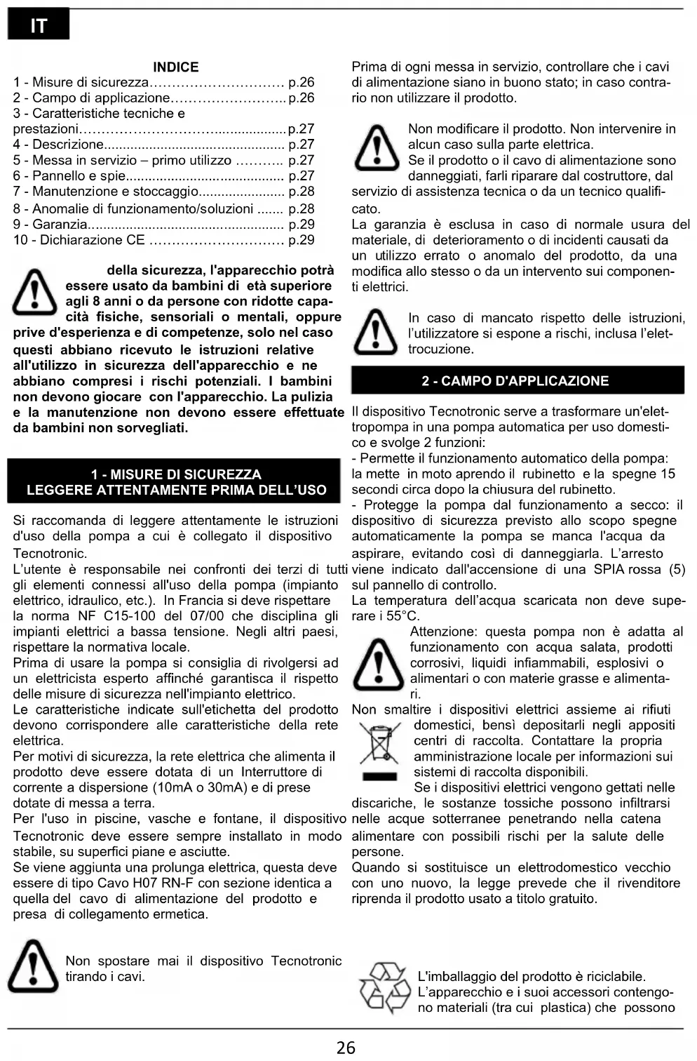 Il dispositivo Tecnotronic serve a trasformare un'elet- tropompa in una pompa automatica per uso domesti- co e svolge 2 funzioni: - Permette il funzionamento automatico della pompa: la mette in moto aprendo il rubinetto e la spegne 15 secondi circa dopo la chiusura del rubinetto. - Protegge la pompa dal funzionamento a secco: il dispositivo di sicurezza previsto allo scopo spegne automaticamente la pompa se manca l'acqua da aspirare, evitando così di danneggiarla. L’arresto viene indicato dall'accensione di una SPIA rossa (5) sul pannello di controllo. La temperatura dell’acqua scaricata non deve supe- rare i 55°C. Attenzione: questa pompa non è adatta al funzionamento con acqua salata, prodotti corrosivi, liquidi infiammabili, esplosivi o alimentari o con materie grasse e alimenta- ri. Non smaltire i dispositivi elettrici assieme ai rifiuti domestici, bensì depositarli negli appositi centri di raccolta. Contattare la propria amministrazione locale per informazioni sui sistemi di raccolta disponibili. Se i dispositivi elettrici vengono gettati nelle discariche, le sostanze tossiche possono infiltrarsi nelle acque sotterranee penetrando nella catena alimentare con possibili rischi per la salute delle persone. Quando si sostituisce un elettrodomestico vecchio con uno nuovo, la legge prevede che il rivenditore riprenda il prodotto usato a titolo gratuito. L'imballaggio del prodotto è riciclabile. L’apparecchio e i suoi accessori contengo- no materiali (tra cui plastica) che possono IT27