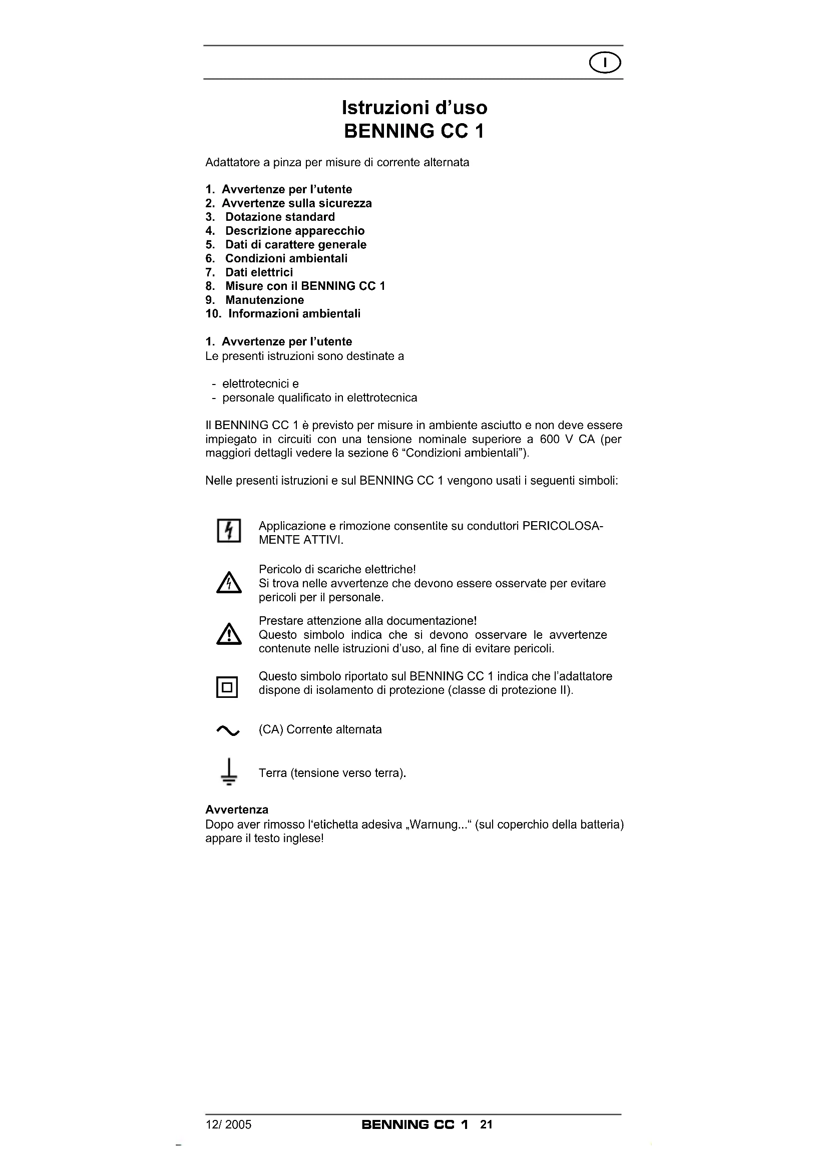 Istruzioni d’uso BENNING CC 1 Adattatore a pinza per misure di corrente alternata1. Avvertenze per l’utente2. Avvertenze sulla sicurezza3. Dotazione standard4. Descrizione apparecchio5. Dati di carattere generale6. Condizioni ambientali7. Dati elettrici8. Misure con il BENNING CC 19. Manutenzione10. Informazioni ambientali1. Avvertenze per l’utenteLe presenti istruzioni sono destinate a - elettrotecnici e - personale qualicato in elettrotecnicaIl BENNING CC 1 è previsto per misure in ambiente asciutto e non deve essere impiegato in circuiti con una tensione nominale superiore a 600 V CA (per maggiori dettagli vedere la sezione 6 “Condizioni ambientali”). Nelle presenti istruzioni e sul BENNING CC 1 vengono usati i seguenti simboli:Applicazione e rimozione consentite su conduttori PERICOLOSA-MENTE ATTIVI. Pericolo di scariche elettriche! Si trova nelle avvertenze che devono essere osservate per evitare pericoli per il personale. Prestare attenzione alla documentazione! Questo simbolo indica che si devono osservare le avvertenze contenute nelle istruzioni d’uso, al ne di evitare pericoli. Questo simbolo riportato sul BENNING CC 1 indica che l’adattatore dispone di isolamento di protezione (classe di protezione II). (CA) Corrente alternataTerra (tensione verso terra).AvvertenzaDopo aver rimosso l‘etichetta adesiva „Warnung...“ (sul coperchio della batteria) appare il testo inglese!12/ 2005
