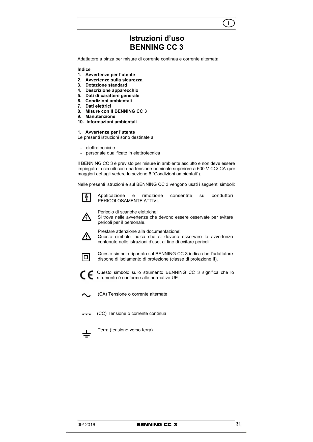 Istruzioni d’uso BENNING CC 3 Adattatore a pinza per misure di corrente continua e corrente alternataIndice1. Avvertenze per l’utente2. Avvertenze sulla sicurezza3. Dotazione standard4. Descrizione apparecchio5. Dati di carattere generale6. Condizioni ambientali7. Dati elettrici8. Misure con il BENNING CC 39. Manutenzione10. Informazioni ambientali1. Avvertenze per l’utenteLe presenti istruzioni sono destinate a - elettrotecnici e - personale qualificato in elettrotecnicaIl BENNING CC 3 è previsto per misure in ambiente asciutto e non deve essere impiegato in circuiti con una tensione nominale superiore a 600 V CC/ CA (per maggiori dettagli vedere la sezione 6 “Condizioni ambientali”).Nelle presenti istruzioni e sul BENNING CC 3 vengono usati i seguenti simboli:Applicazione e rimozione consentite su conduttori PERICOLOSAMENTE ATTIVI. Pericolo di scariche elettriche!Si trova nelle avvertenze che devono essere osservate per evitare pericoli per il personale. Prestare attenzione alla documentazione!Questo simbolo indica che si devono osservare le avvertenze contenute nelle istruzioni d’uso, al fine di evitare pericoli. Questo simbolo riportato sul BENNING CC 3 indica che l’adattatore dispone di isolamento di protezione (classe di protezione II).Questo simbolo sullo strumento BENNING CC 3 significa che lo strumento è conforme alle normative UE. (CA) Tensione o corrente alternate(CC) Tensione o corrente continua Terra (tensione verso terra)09/ 2016 BENNING CC 3