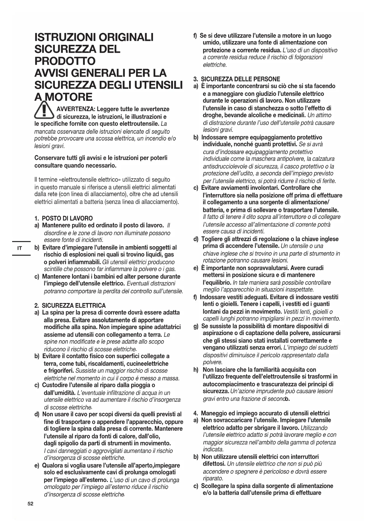 a) Non sovraccaricare l’utensile. Impiegare l’utensile elettrico adatto per sbrigare il lavoro. Utilizzando l’utensile elettrico adatto si potrà lavorare meglio e con maggior sicurezza nell’ambito della gamma di potenza indicata. b) Non utilizzare utensili elettrici con interruttori difettosi. Un utensile elettrico che non si può più accendere o spegnere è pericoloso e dovrà essere riparato. c) Scollegare la spina dalla sorgente di alimentazione e/o la batteria dall’utensile prima di effettuareIT