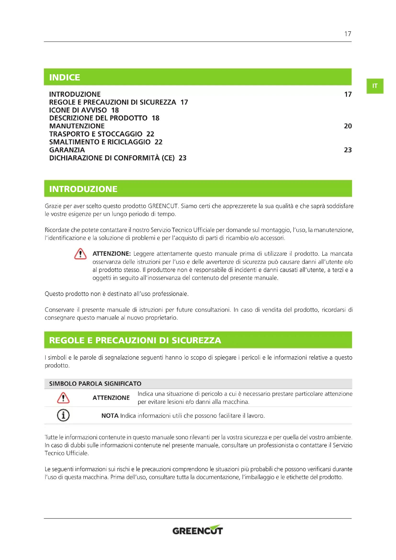 INTRODUZIONE Grazie per aver scelto questo prodotto GREENCUT. Siamo certi che apprezzerete la sua qualità e che saprà soddisfare le vostre esigenze per un lungo periodo di tempo. Ricordate che potete contattare il nostro Servizio Tecnico Ufciale per domande sul montaggio, l’uso, la manutenzione, l’identicazione e la soluzione di problemi e per l’acquisto di parti di ricambio e/o accessori. ATTENZIONE: Leggere attentamente questo manuale prima di utilizzare il prodotto. La mancata osservanza delle istruzioni per l’uso e delle avvertenze di sicurezza può causare danni all’utente e/o al prodotto stesso. Il produttore non è responsabile di incidenti e danni causati all’utente, a terzi e a oggetti in seguito all’inosservanza del contenuto del presente manuale. Questo prodotto non è destinato all’uso professionale. Conservare il presente manuale di istruzioni per future consultazioni. In caso di vendita del prodotto, ricordarsi di consegnare questo manuale al nuovo proprietario.
