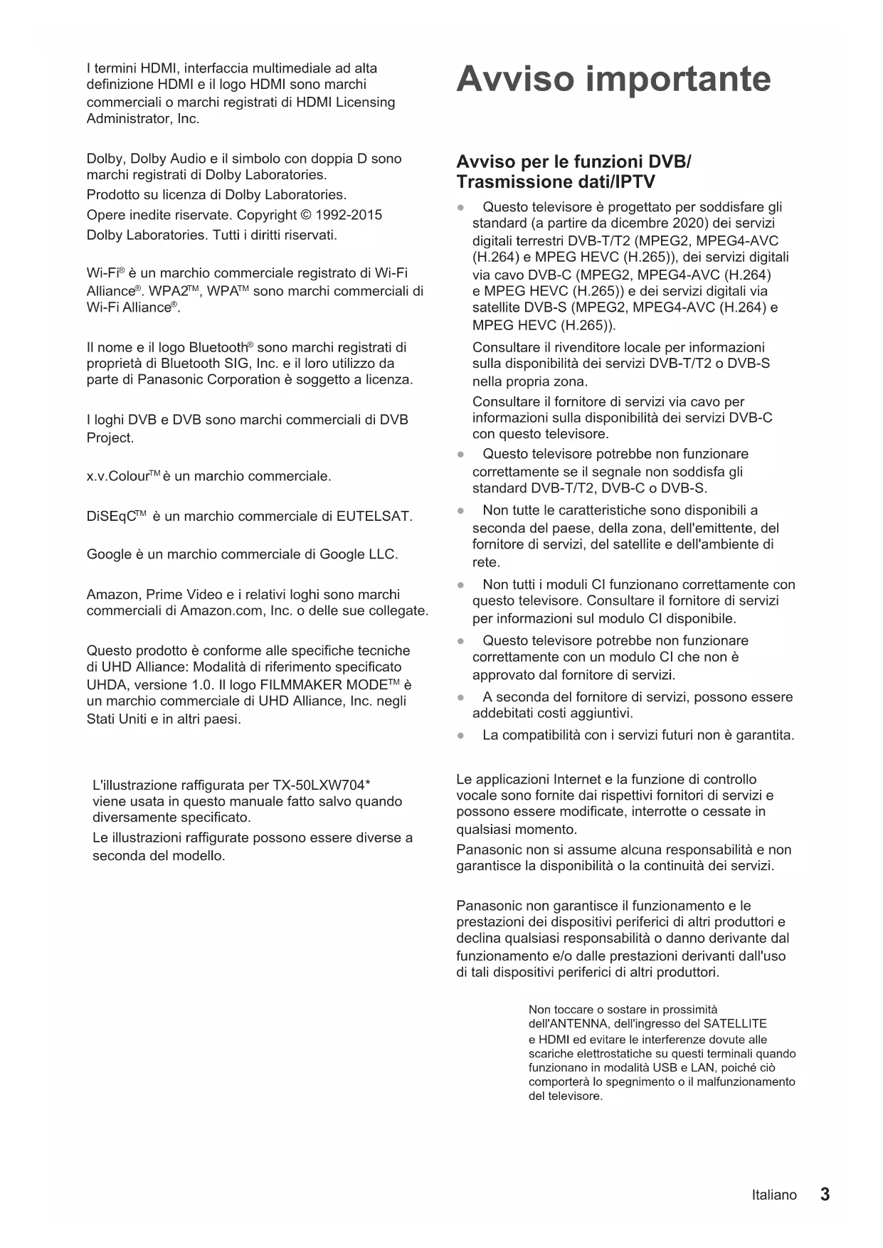 un marchio commerciale di UHD Alliance, Inc. negli Stati Uniti e in altri paesi. L'illustrazione raffigurata per TX-50LXW704* viene usata in questo manuale fatto salvo quando diversamente specificato. Le illustrazioni raffigurate possono essere diverse a seconda del modello. Avviso importante Avviso per le funzioni DVB/ Trasmissione dati/IPTV ● Questo televisore è progettato per soddisfare gli standard (a partire da dicembre 2020) dei servizi digitali terrestri DVB-T/T2 (MPEG2, MPEG4-AVC (H.264) e MPEG HEVC (H.265)), dei servizi digitali via cavo DVB-C (MPEG2, MPEG4-AVC (H.264) e MPEG HEVC (H.265)) e dei servizi digitali via satellite DVB-S (MPEG2, MPEG4-AVC (H.264) e MPEG HEVC (H.265)). Consultare il rivenditore locale per informazioni sulla disponibilità dei servizi DVB-T/T2 o DVB-S nella propria zona. Consultare il fornitore di servizi via cavo per informazioni sulla disponibilità dei servizi DVB-C con questo televisore. ● Questo televisore potrebbe non funzionare correttamente se il segnale non soddisfa gli standard DVB-T/T2, DVB-C o DVB-S. ● Non tutte le caratteristiche sono disponibili a seconda del paese, della zona, dell'emittente, del fornitore di servizi, del satellite e dell'ambiente di rete. ● Non tutti i moduli CI funzionano correttamente con questo televisore. Consultare il fornitore di servizi per informazioni sul modulo CI disponibile. ● Questo televisore potrebbe non funzionare correttamente con un modulo CI che non è approvato dal fornitore di servizi. ● A seconda del fornitore di servizi, possono essere addebitati costi aggiuntivi. ● La compatibilità con i servizi futuri non è garantita. Le applicazioni Internet e la funzione di controllo vocale sono fornite dai rispettivi fornitori di servizi e possono essere modificate, interrotte o cessate in qualsiasi momento. Panasonic non si assume alcuna responsabilità e non garantisce la disponibilità o la continuità dei servizi. Panasonic non garantisce il funzionamento e le prestazioni dei dispositivi periferici di altri produttori e declina qualsiasi responsabilità o danno derivante dal funzionamento e/o dalle prestazioni derivanti dall'uso di tali dispositivi periferici di altri produttori. Non toccare o sostare in prossimità dell'ANTENNA, dell'ingresso del SATELLITE e HDMI ed evitare le interferenze dovute alle scariche elettrostatiche su questi terminali quando funzionano in modalità USB e LAN, poiché ciò comporterà lo spegnimento o il malfunzionamento del televisore.Italiano