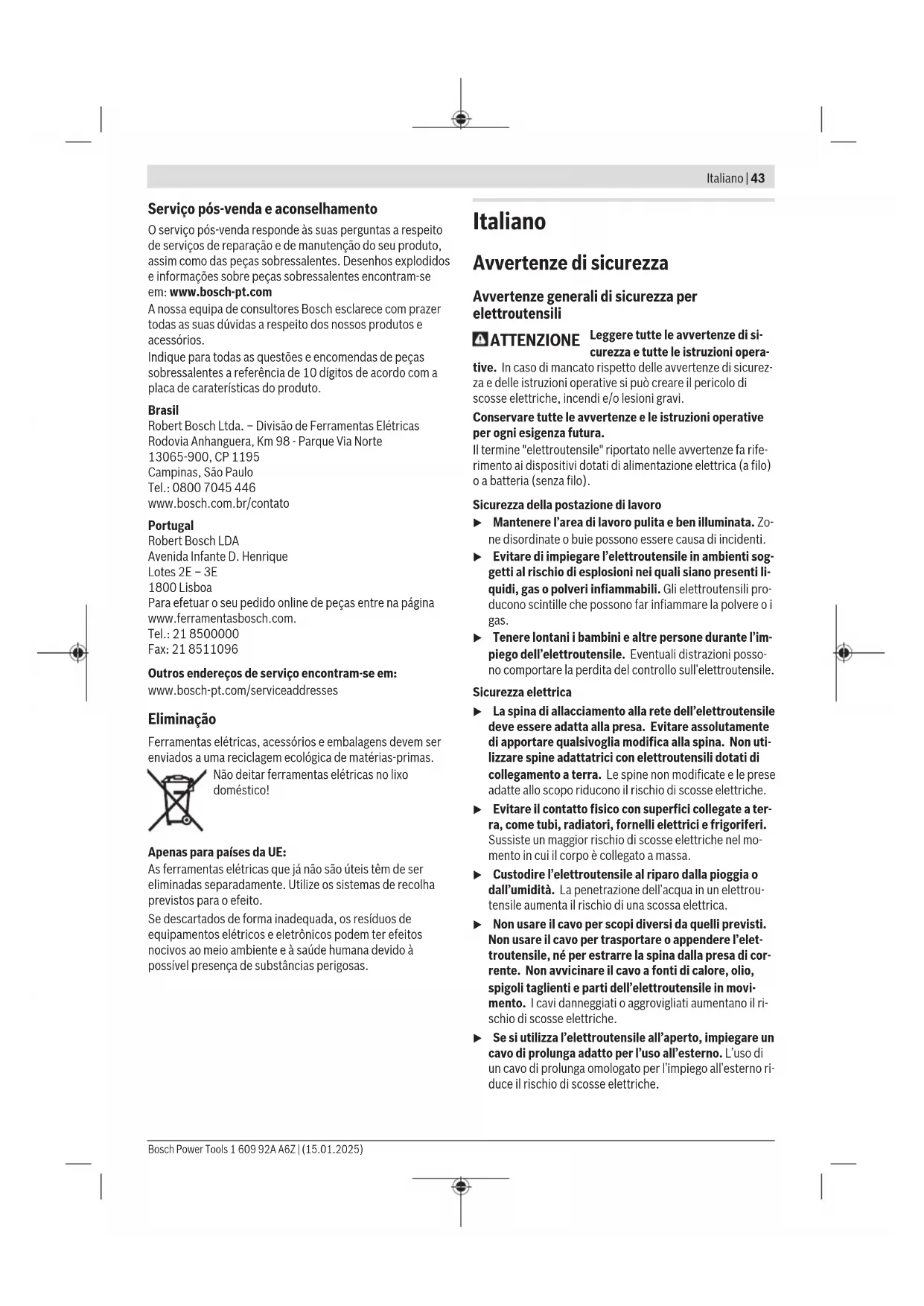 Desativação de contragolpe Em caso de contragolpe repentino da ferramenta elétrica, p. ex. bloqueio ao fresar, é interrompida eletronicamente a alimentação de corrente para o motor. Para recolocar em funcionamento coloque o interruptor de ligar/desligar(5)/(11) na posição desligada e ligue novamente a ferramenta elétrica. Proteção contra rearranque involuntário A proteção contra rearranque involuntário evita que a ferramenta elétrica possa arrancar descontroladamente após uma interrupção da alimentação de corrente elétrica. Para recolocar em funcionamento coloque o interruptor de ligar/desligar(5)/(11) na posição desligada e ligue novamente a ferramenta elétrica. Nota: No caso de desligar e voltar a ligar demasiado rápido, a proteção contra rearranque involuntário pode ativar-se e a ferramenta elétrica não arranca mesmo acionando o interruptor de ligar/desligar (5)/(11). Coloque o interruptor de ligar/desligar (5)/(11) na posição desligada e ligue novamente a ferramenta elétrica. Arranque suave O arranque suave eletrónico limita o binário ao ligar e aumenta a durabilidade do motor. Instruções de trabalho u Antes de todos trabalhos na ferramenta elétrica deverá puxar a ficha de rede da tomada. u Guarde as ferramentas de lixar protegidas contra embates. u Não sobrecarregar demasiado a ferramenta elétrica, provocando uma paragem. u Após um trabalho com carga elevada, deverá permitir que a ferramenta elétrica funcione alguns minutos em vazio, para que o acessório possa arrefecer. u Os abrasivos tornam‑se extremamente quentes durante o trabalho. Não toque nos mesmos antes de terem arrefecido. A fim de obter um excelente resultado de trabalho, desloque os abrasivos para trás e para a frente, exercendo uma ligeira pressão. Uma pressão muito elevada reduz a capacidade da ferramenta elétrica e causa um rápido desgaste do abrasivo. Manutenção e assistência técnica Manutenção e limpeza u Antes de todos trabalhos na ferramenta elétrica deverá puxar a ficha de rede da tomada. u Manter a ferramenta elétrica e as aberturas de ventilação sempre limpas, para trabalhar bem e de forma segura. u Em condições de utilização extremas utilize sempre, se possível, um sistema de aspiração. Sopre frequentemente as aberturas de ventilação e interconecte um disjuntor de corrente de avaria (PRCD). Durante o processamento de metais é possível que se deposite pó condutivo no interior da ferramenta elétrica. Isto pode prejudicar o isolamento de proteção da ferramenta elétrica. Os acessórios devem ser armazenados e tratados com cuidado. Se for necessário instalar um cabo de ligação, a instalação deve ser feita pela Bosch ou por um centro de serviço autorizado para ferramentas elétricas Bosch, para evitar perigos de segurança. 1 609 92A A6Z | (15.01.2025) Bosch Power ToolsItaliano | 43 Serviço pós-venda e aconselhamento O serviço pós-venda responde às suas perguntas a respeito de serviços de reparação e de manutenção do seu produto, assim como das peças sobressalentes. Desenhos explodidos e informações sobre peças sobressalentes encontram‑se em: www.bosch‑pt.com A nossa equipa de consultores Bosch esclarece com prazer todas as suas dúvidas a respeito dos nossos produtos e acessórios. Indique para todas as questões e encomendas de peças sobressalentes a referência de 10dígitos de acordo com a placa de caraterísticas do produto. Brasil Robert Bosch Ltda. – Divisão de Ferramentas Elétricas Rodovia Anhanguera, Km 98 - Parque Via Norte 13065-900, CP 1195 Campinas, São Paulo Tel.: 0800 7045 446 www.bosch.com.br/contato Portugal Robert Bosch LDA Avenida Infante D. Henrique Lotes 2E – 3E 1800 Lisboa Para efetuar o seu pedido online de peças entre na página www.ferramentasbosch.com. Tel.: 21 8500000 Fax: 21 8511096 Outros endereços de serviço encontram-se em: www.bosch-pt.com/serviceaddresses Eliminação Ferramentas elétricas, acessórios e embalagens devem ser enviados a uma reciclagem ecológica de matérias-primas. Não deitar ferramentas elétricas no lixo doméstico! Apenas para países da UE: As ferramentas elétricas que já não são úteis têm de ser eliminadas separadamente. Utilize os sistemas de recolha previstos para o efeito. Se descartados de forma inadequada, os resíduos de equipamentos elétricos e eletrônicos podem ter efeitos nocivos ao meio ambiente e à saúde humana devido à possível presença de substâncias perigosas. Italiano Avvertenze di sicurezza Avvertenze generali di sicurezza per elettroutensili ATTENZIONE Leggere tutte le avvertenze di si- curezza e tutte le istruzioni opera- tive. In caso di mancato rispetto delle avvertenze di sicurez- za e delle istruzioni operative si può creare il pericolo di scosse elettriche, incendi e/o lesioni gravi. Conservare tutte le avvertenze e le istruzioni operative per ogni esigenza futura. Il termine "elettroutensile" riportato nelle avvertenze fa rife- rimento ai dispositivi dotati di alimentazione elettrica (a filo) o a batteria (senza filo). Sicurezza della postazione di lavoro u Mantenere l’area di lavoro pulita e ben illuminata. Zo- ne disordinate o buie possono essere causa di incidenti. u Evitare di impiegare l’elettroutensile in ambienti sog- getti al rischio di esplosioni nei quali siano presenti li- quidi, gas o polveri infiammabili. Gli elettroutensili pro- ducono scintille che possono far infiammare la polvere o i gas. u Tenere lontani i bambini e altre persone durante l’im- piego dell’elettroutensile. Eventuali distrazioni posso- no comportare la perdita del controllo sull’elettroutensile. Sicurezza elettrica u La spina di allacciamento alla rete dell’elettroutensile deve essere adatta alla presa. Evitare assolutamente di apportare qualsivoglia modifica alla spina. Non uti- lizzare spine adattatrici con elettroutensili dotati di collegamento a terra. Le spine non modificate e le prese adatte allo scopo riduco