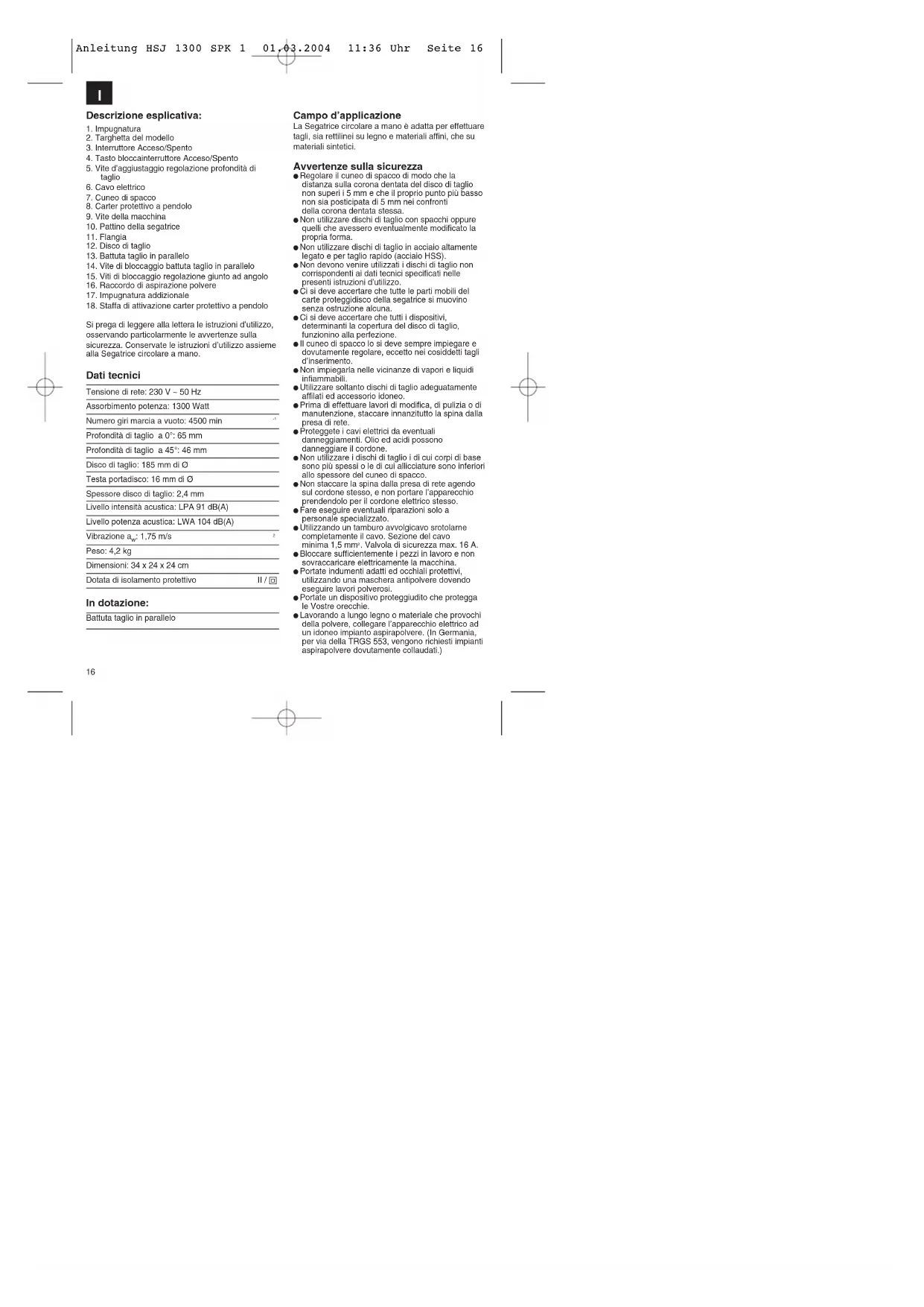 Si prega di leggere alla lettera le istruzioni d’utilizzo, osservando particolarmente le avvertenze sulla sicurezza. Conservate le istruzioni d’utilizzo assieme alla Segatrice circolare a mano. Dati tecnici Tensione di rete: 230 V ~ 50 Hz Assorbimento potenza: 1300 Watt Numero giri marcia a vuoto: 4500 min
