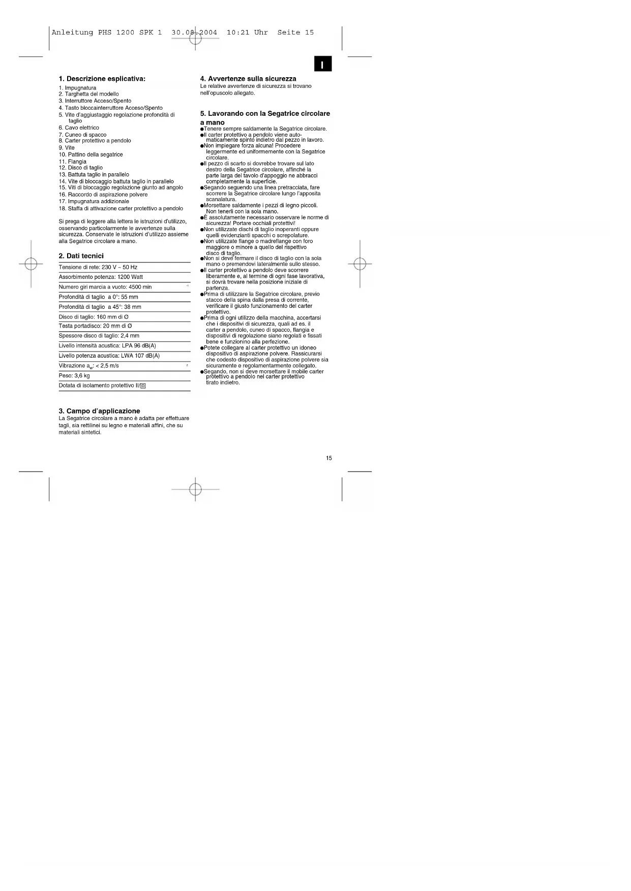 a mano Tenere sempre saldamente la Segatrice circolare. Il carter protettivo a pendolo viene auto- maticamente spinto indietro dal pezzo in lavoro. Non impiegare forza alcuna! Procedere leggermente ed uniformemente con la Segatrice circolare. Il pezzo di scarto si dovrebbe trovare sul lato destro della Segatrice circolare, affinché la parte larga del tavolo d’appoggio ne abbracci completamente la superficie. Segando seguendo una linea pretracciata, fare scorrere la Segatrice circolare lungo l’apposita scanalatura. Morsettare saldamente i pezzi di legno piccoli. Non tenerli con la sola mano. È assolutamente necessario osservare le norme di sicurezza! Portare occhiali protettivi! Non utilizzate dischi di taglio inoperanti oppure quelli evidenzianti spacchi o screpolature. Non utilizzate flange o madreflange con foro maggiore o minore a quello del rispettivo disco di taglio. Non si deve fermare il disco di taglio con la sola mano o premendovi lateralmente sullo stesso. Il carter protettivo a pendolo deve scorrere liberamente e, al termine di ogni fase lavorativa, si dovrà trovare nella posizione iniziale di partenza. Prima di utilizzare la Segatrice circolare, previo stacco della spina dalla presa di corrente, verificare il giusto funzionamento del carter protettivo. Prima di ogni utilizzo della macchina, accertarsi che i dispositivi di sicurezza, quali ad es. il carter a pendolo, cuneo di spacco, flangia e dispositivi di regolazione siano regolati e fissati bene e funzionino alla perfezione. Potete collegare al carter protettivo un idoneo dispositivo di aspirazione polvere. Rassicurarsi che codesto dispositivo di aspirazione polvere sia sicuramente e regolamentarmente collegato. Segando, non si deve morsettare il mobile carter protettivo a pendolo nel carter protettivo tirato indietro. Anleitung PHS 1200 SPK 1 30.08.2004 10:21 Uhr Seite 1516