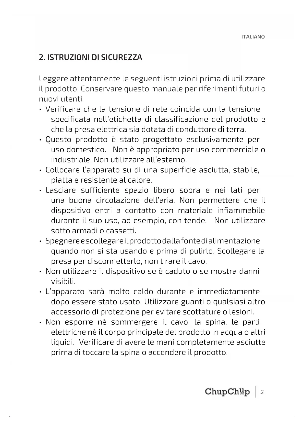 - Non esporre nè sommergere il cavo, la spina, le parti elettriche nè il corpo principale del prodotto in acqua o altri liquidi. Verificare di avere le mani completamente asciutte prima di toccare la spina o accendere il prodotto.ITALIANO