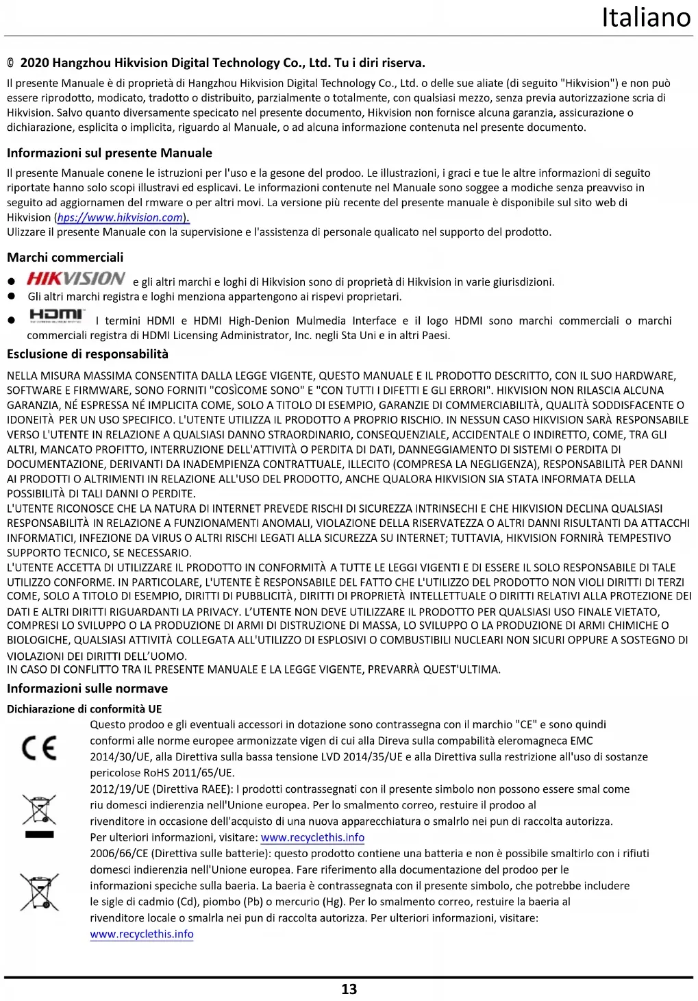 © 2020 Hangzhou Hikvision Digital Technology Co., Ltd. Tutti i diritti riservati. Il presente Manuale è di proprietà di Hangzhou Hikvision Digital Technology Co., Ltd. o delle sue affiliate (di seguito "Hikvision") e non può essere riprodotto, modificato, tradotto o distribuito, parzialmente o totalmente, con qualsiasi mezzo, senza previa autorizzazione scritta di Hikvision. Salvo quanto diversamente specificato nel presente documento, Hikvision non fornisce alcuna garanzia, assicurazione o dichiarazione, esplicita o implicita, riguardo al Manuale, o ad alcuna informazione contenuta nel presente documento. Informazioni sul presente Manuale Il presente Manuale contiene le istruzioni per l'uso e la gestione del prodotto. Le illustrazioni, i grafici e tutte le altre informazioni di seguito riportate hanno solo scopi illustrativi ed esplicativi. Le informazioni contenute nel Manuale sono soggette a modifiche senza preavviso in seguito ad aggiornamenti del firmware o per altri motivi. La versione più recente del presente manuale è disponibile sul sito web di Hikvision (http s://www.hikvision.com). Utilizzare il presente Manuale con la supervisione e l'assistenza di personale qualificato nel supporto del prodotto. Marchi commerciali e gli altri marchi e loghi di Hikvision sono di proprietà di Hikvision in varie giurisdizioni. Gli altri marchi registrati e loghi menzionati appartengono ai rispettivi proprietari. I termini HDMI e HDMI High-Definition Multimedia Interface e il logo HDMI sono marchi commerciali o marchi commerciali registrati di HDMI Licensing Administrator, Inc. negli Stati Uniti e in altri Paesi. Esclusione di responsabilità NELLA MISURA MASSIMA CONSENTITA DALLA LEGGE VIGENTE, QUESTO MANUALE E IL PRODOTTO DESCRITTO, CON IL SUO HARDWARE, SOFTWARE E FIRMWARE, SONO FORNITI "COSÌ COME SONO" E "CON TUTTI I DIFETTI E GLI ERRORI". HIKVISION NON RILASCIA ALCUNA GARANZIA, NÉ ESPRESSA NÉ IMPLICITA COME, SOLO A TITOLO DI ESEMPIO, GARANZIE DI COMMERCIABILITÀ, QUALITÀ SODDISFACENTE O IDONEITÀ PER UN USO SPECIFICO. L'UTENTE UTILIZZA IL PRODOTTO A PROPRIO RISCHIO. IN NESSUN CASO HIKVISION SARÀ RESPONSABILE VERSO L'UTENTE IN RELAZIONE A QUALSIASI DANNO STRAORDINARIO, CONSEQUENZIALE, ACCIDENTALE O INDIRETTO, COME, TRA GLI ALTRI, MANCATO PROFITTO, INTERRUZIONE DELL'ATTIVITÀ O PERDITA DI DATI, DANNEGGIAMENTO DI SISTEMI O PERDITA DI DOCUMENTAZIONE, DERIVANTI DA INADEMPIENZA CONTRATTUALE, ILLECITO (COMPRESA LA NEGLIGENZA), RESPONSABILITÀ PER DANNI AI PRODOTTI O ALTRIMENTI IN RELAZIONE ALL'USO DEL PRODOTTO, ANCHE QUALORA HIKVISION SIA STATA INFORMATA DELLA POSSIBILITÀ DI TALI DANNI O PERDITE. L'UTENTE RICONOSCE CHE LA NATURA DI INTERNET PREVEDE RISCHI DI SICUREZZA INTRINSECHI E CHE HIKVISION DECLINA QUALSIASI RESPONSABILITÀ IN RELAZIONE A FUNZIONAMENTI ANOMALI, VIOLAZIONE DELLA RISERVATEZZA O ALTRI DANNI RISULTANTI DA ATTACCHI INFORMATICI, INFEZIONE DA VIRUS O ALTRI RISCHI LEGATI ALLA SICUREZZA SU INTERNET; TUTTAVIA, HIKVISION FORNIRÀ TEMPESTIVO SUPPORTO TECNICO, SE NECESSARIO. L'UTENTE ACCETTA DI UTILIZZARE IL PRODOTTO IN CONFORMITÀ A TUTTE LE LEGGI VIGENTI E DI ESSERE IL SOLO RESPONSABILE DI TALE UTILIZZO CONFORME. IN PARTICOLARE, L'UTENTE È RESPONSABILE DEL FATTO CHE L'UTILIZZO DEL PRODOTTO NON VIOLI DIRITTI DI TERZI COME, SOLO A TITOLO DI ESEMPIO, DIRITTI DI PUBBLICITÀ, DIRITTI DI PROPRIETÀ INTELLETTUALE O DIRITTI RELATIVI ALLA PROTEZIONE DEI DATI E ALTRI DIRITTI RIGUARDANTI LA PRIVACY. L’UTENTE NON DEVE UTILIZZARE IL PRODOTTO PER QUALSIASI USO FINALE VIETATO, COMPRESI LO SVILUPPO O LA PRODUZIONE DI ARMI DI DISTRUZIONE DI MASSA, LO SVILUPPO O LA PRODUZIONE DI ARMI CHIMICHE O BIOLOGICHE, QUALSIASI ATTIVITÀ COLLEGATA ALL'UTILIZZO DI ESPLOSIVI O COMBUSTIBILI NUCLEARI NON SICURI OPPURE A SOSTEGNO DI VIOLAZIONI DEI DIRITTI DELL’UOMO. IN CASO DI CONFLITTO TRA IL PRESENTE MANUALE E LA LEGGE VIGENTE, PREVARRÀ QUEST'ULTIMA. Informazioni sulle normative Dichiarazione di conformità UE