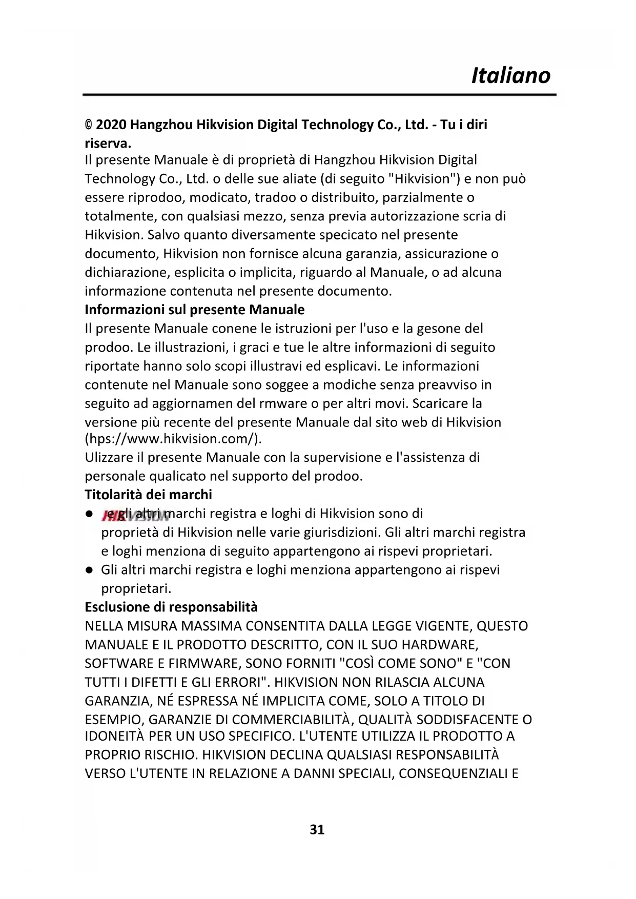 © 2020 Hangzhou Hikvision Digital Technology Co., Ltd. - Tutti i diritti riservati. Il presente Manuale è di proprietà di Hangzhou Hikvision Digital Technology Co., Ltd. o delle sue affiliate (di seguito "Hikvision") e non può essere riprodotto, modificato, tradotto o distribuito, parzialmente o totalmente, con qualsiasi mezzo, senza previa autorizzazione scritta di Hikvision. Salvo quanto diversamente specificato nel presente documento, Hikvision non fornisce alcuna garanzia, assicurazione o dichiarazione, esplicita o implicita, riguardo al Manuale, o ad alcuna informazione contenuta nel presente documento. Informazioni sul presente Manuale Il presente Manuale contiene le istruzioni per l'uso e la gestione del prodotto. Le illustrazioni, i grafici e tutte le altre informazioni di seguito riportate hanno solo scopi illustrativi ed esplicativi. Le informazioni contenute nel Manuale sono soggette a modifiche senza preavviso in seguito ad aggiornamenti del firmware o per altri motivi. Scaricare la versione più recente del presente Manuale dal sito web di Hikvision (https://www.hikvision.com/). Utilizzare il presente Manuale con la supervisione e l'assistenza di personale qualificato nel supporto del prodotto. Titolarità dei marchi e gli altri marchi registrati e loghi di Hikvision sono di proprietà di Hikvision nelle varie giurisdizioni. Gli altri marchi registrati e loghi menzionati di seguito appartengono ai rispettivi proprietari. Gli altri marchi registrati e loghi menzionati appartengono ai rispettivi proprietari. Esclusione di responsabilità NELLA MISURA MASSIMA CONSENTITA DALLA LEGGE VIGENTE, QUESTO MANUALE E IL PRODOTTO DESCRITTO, CON IL SUO HARDWARE, SOFTWARE E FIRMWARE, SONO FORNITI "COSÌ COME SONO" E "CON TUTTI I DIFETTI E GLI ERRORI". HIKVISION NON RILASCIA ALCUNA GARANZIA, NÉ ESPRESSA NÉ IMPLICITA COME, SOLO A TITOLO DI ESEMPIO, GARANZIE DI COMMERCIABILITÀ, QUALITÀ SODDISFACENTE O IDONEITÀ PER UN USO SPECIFICO. L'UTENTE UTILIZZA IL PRODOTTO A