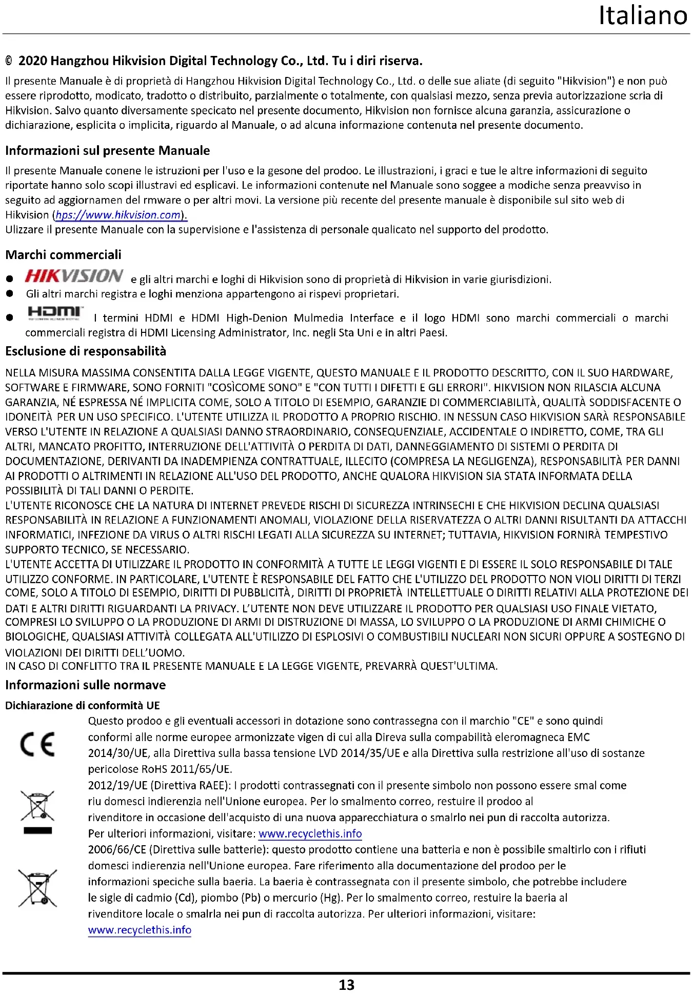 © 2020 Hangzhou Hikvision Digital Technology Co., Ltd. Tutti i diritti riservati. Il presente Manuale è di proprietà di Hangzhou Hikvision Digital Technology Co., Ltd. o delle sue affiliate (di seguito "Hikvision") e non può essere riprodotto, modificato, tradotto o distribuito, parzialmente o totalmente, con qualsiasi mezzo, senza previa autorizzazione scritta di Hikvision. Salvo quanto diversamente specificato nel presente documento, Hikvision non fornisce alcuna garanzia, assicurazione o dichiarazione, esplicita o implicita, riguardo al Manuale, o ad alcuna informazione contenuta nel presente documento. Informazioni sul presente Manuale Il presente Manuale contiene le istruzioni per l'uso e la gestione del prodotto. Le illustrazioni, i grafici e tutte le altre informazioni di seguito riportate hanno solo scopi illustrativi ed esplicativi. Le informazioni contenute nel Manuale sono soggette a modifiche senza preavviso in seguito ad aggiornamenti del firmware o per altri motivi. La versione più recente del presente manuale è disponibile sul sito web di Hikvision (http s://www.hikvision.com). Utilizzare il presente Manuale con la supervisione e l'assistenza di personale qualificato nel supporto del prodotto. Marchi commerciali e gli altri marchi e loghi di Hikvision sono di proprietà di Hikvision in varie giurisdizioni. Gli altri marchi registrati e loghi menzionati appartengono ai rispettivi proprietari. I termini HDMI e HDMI High-Definition Multimedia Interface e il logo HDMI sono marchi commerciali o marchi commerciali registrati di HDMI Licensing Administrator, Inc. negli Stati Uniti e in altri Paesi. Esclusione di responsabilità NELLA MISURA MASSIMA CONSENTITA DALLA LEGGE VIGENTE, QUESTO MANUALE E IL PRODOTTO DESCRITTO, CON IL SUO HARDWARE, SOFTWARE E FIRMWARE, SONO FORNITI "COSÌ COME SONO" E "CON TUTTI I DIFETTI E GLI ERRORI". HIKVISION NON RILASCIA ALCUNA GARANZIA, NÉ ESPRESSA NÉ IMPLICITA COME, SOLO A TITOLO DI ESEMPIO, GARANZIE DI COMMERCIABILITÀ, QUALITÀ SODDISFACENTE O IDONEITÀ PER UN USO SPECIFICO. L'UTENTE UTILIZZA IL PRODOTTO A PROPRIO RISCHIO. IN NESSUN CASO HIKVISION SARÀ RESPONSABILE VERSO L'UTENTE IN RELAZIONE A QUALSIASI DANNO STRAORDINARIO, CONSEQUENZIALE, ACCIDENTALE O INDIRETTO, COME, TRA GLI ALTRI, MANCATO PROFITTO, INTERRUZIONE DELL'ATTIVITÀ O PERDITA DI DATI, DANNEGGIAMENTO DI SISTEMI O PERDITA DI DOCUMENTAZIONE, DERIVANTI DA INADEMPIENZA CONTRATTUALE, ILLECITO (COMPRESA LA NEGLIGENZA), RESPONSABILITÀ PER DANNI AI PRODOTTI O ALTRIMENTI IN RELAZIONE ALL'USO DEL PRODOTTO, ANCHE QUALORA HIKVISION SIA STATA INFORMATA DELLA POSSIBILITÀ DI TALI DANNI O PERDITE. L'UTENTE RICONOSCE CHE LA NATURA DI INTERNET PREVEDE RISCHI DI SICUREZZA INTRINSECHI E CHE HIKVISION DECLINA QUALSIASI RESPONSABILITÀ IN RELAZIONE A FUNZIONAMENTI ANOMALI, VIOLAZIONE DELLA RISERVATEZZA O ALTRI DANNI RISULTANTI DA ATTACCHI INFORMATICI, INFEZIONE DA VIRUS O ALTRI RISCHI LEGATI ALLA SICUREZZA SU INTERNET; TUTTAVIA, HIKVISION FORNIRÀ TEMPESTIVO SUPPORTO TECNICO, SE NECESSARIO. L'UTENTE ACCETTA DI UTILIZZARE IL PRODOTTO IN CONFORMITÀ A TUTTE LE LEGGI VIGENTI E DI ESSERE IL SOLO RESPONSABILE DI TALE UTILIZZO CONFORME. IN PARTICOLARE, L'UTENTE È RESPONSABILE DEL FATTO CHE L'UTILIZZO DEL PRODOTTO NON VIOLI DIRITTI DI TERZI COME, SOLO A TITOLO DI ESEMPIO, DIRITTI DI PUBBLICITÀ, DIRITTI DI PROPRIETÀ INTELLETTUALE O DIRITTI RELATIVI ALLA PROTEZIONE DEI DATI E ALTRI DIRITTI RIGUARDANTI LA PRIVACY. L’UTENTE NON DEVE UTILIZZARE IL PRODOTTO PER QUALSIASI USO FINALE VIETATO, COMPRESI LO SVILUPPO O LA PRODUZIONE DI ARMI DI DISTRUZIONE DI MASSA, LO SVILUPPO O LA PRODUZIONE DI ARMI CHIMICHE O BIOLOGICHE, QUALSIASI ATTIVITÀ COLLEGATA ALL'UTILIZZO DI ESPLOSIVI O COMBUSTIBILI NUCLEARI NON SICURI OPPURE A SOSTEGNO DI VIOLAZIONI DEI DIRITTI DELL’UOMO. IN CASO DI CONFLITTO TRA IL PRESENTE MANUALE E LA LEGGE VIGENTE, PREVARRÀ QUEST'ULTIMA. Informazioni sulle normative Dichiarazione di conformità UE