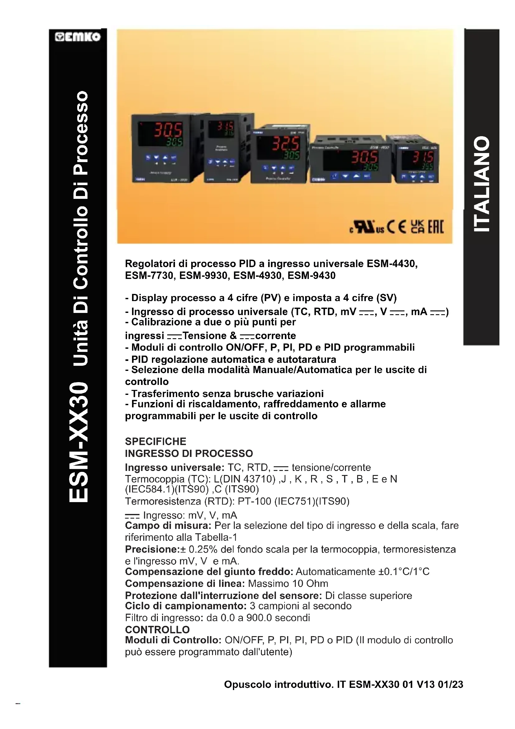 Ingresso universale: TC, RTD, Z tensione/corrente Termocoppia (TC): L(DIN 43710) ,J , K , R , S , T , B , E e N (IEC584.1)(ITS90) ,C (ITS90) Termoresistenza (RTD): PT-100 (IEC751)(ITS90) Z Ingresso: mV, V, mA Campo di misura: Per la selezione del tipo di ingresso e della scala, fare riferimento alla Tabella-1 Precisione:± 0.25% del fondo scala per la termocoppia, termoresistenza e l'ingresso mV, V e mA. Compensazione del giunto freddo: Automaticamente ±0.1°C/1°C Compensazione di linea: Massimo 10 Ohm Protezione dall'interruzione del sensore: Di classe superiore Ciclo di campionamento: 3 campioni al secondo Filtro di ingresso: da 0.0 a 900.0 secondi CONTROLLO Moduli di Controllo: ON/OFF, P, PI, PI, PD o PID (Il modulo di controllo può essere programmato dall'utente) Opuscolo introduttivo. IT ESM-XX30 01 V13 01/23DISPLAY Display processo: ESM-4430 : Display a LED a 4 cifre rosse da 10.1 mm ESM-4930 : Display a LED a 4 cifre rosse da 13.2 mm ESM-7730 : Display a LED a 4 cifre rosse da 13.2 mm ESM-9930 : Display a LED a 4 cifre rosse da 19 mm ESM-9430 : Display a LED a 4 cifre rosse da 10.1 mm Display valore impostato: ESM-4430 : Display a LED a 4 cifre verde da 8 mm ESM-4930 : Display a LED a 4 cifre verde da 8 mm ESM-7730 : Display a LED a 4 cifre verde da 9.1 mm ESM-9930 :Display a LED a 4 cifre verde da 10.8 mm ESM-9430 : Display a LED a 4 cifre verde da 8 mm LED: AT(Autotaratura), M (modalità manuale), A (modalità automatica), Led PSET / ASET1 / ASET2 (Imposta controllo o allarme) Leds, PO, AO1, AO2 (stato di controllo o allarme) °C / °F / V USCITA Uscite a relè standard: due relè. 5A@250VV(a carico resistivo) (possono essere programmate come uscita di controllo o di allarme) Uscita driver SSR: Massimo 17mA, massimo 25V Z