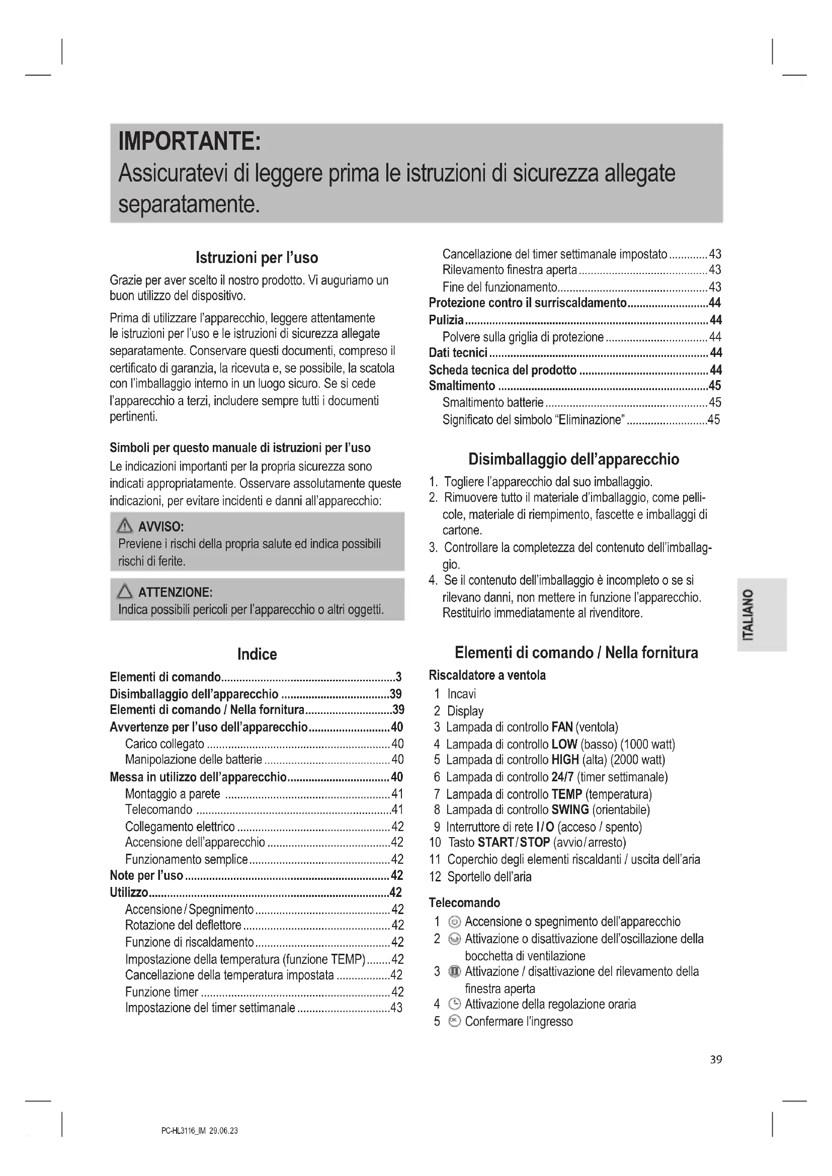 - Le batterie non devono essere smaltite insieme ai rifiuti domestici. Restituire le batterie usate ai centri di raccolta competenti o al rivenditore. Messa in utilizzo dell’apparecchio Le superfici sensibili, come il display, possono essere protette da pellicole di plastica. Rimuovere queste pellicole di plastica.PC-HL3116_IM 29.06.23
