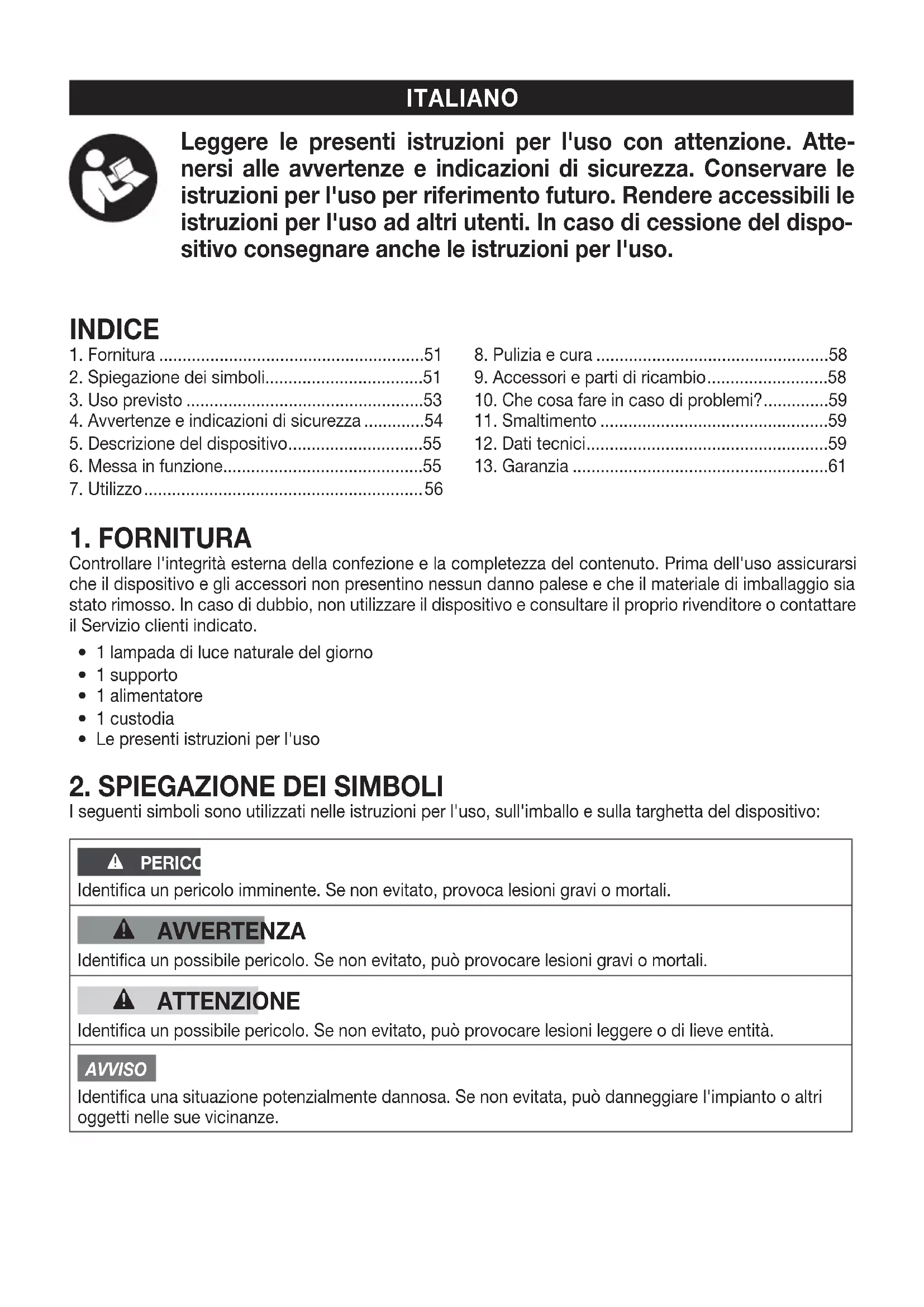 La lampada di luce naturale del giorno può essere utilizzata esclusivamente con l'alimentatore descrit- to nelle presenti istruzioni per l'uso per evitare possibili danni al dispositivo.