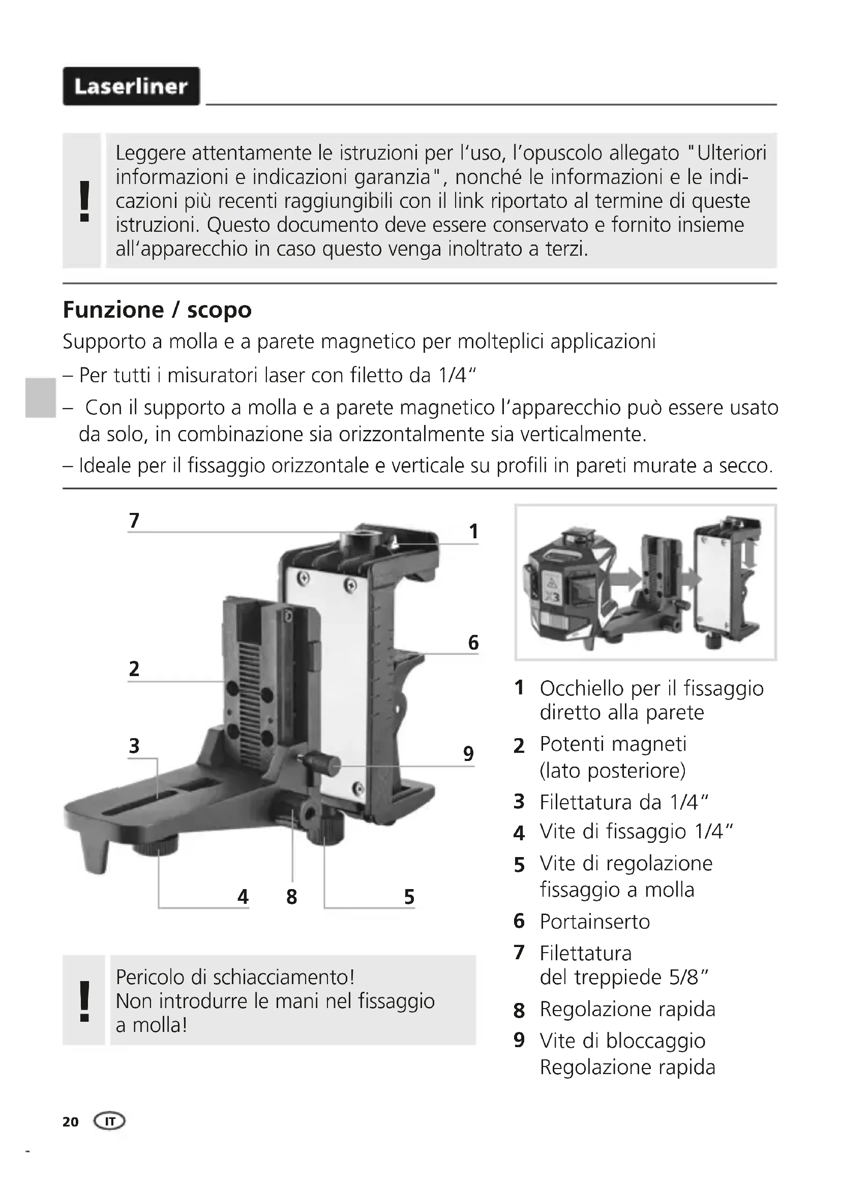 Funzione / scopo Supporto a molla e a parete magnetico per molteplici applicazioni – Per tutti i misuratori laser con letto da 1/4“ – Con il supporto a molla e a parete magnetico l‘apparecchio può essere usato da solo, in combinazione sia orizzontalmente sia verticalmente. – Ideale per il ssaggio orizzontale e verticale su proli in pareti murate a secco. Leggere attentamente le istruzioni per l‘uso, l’opuscolo allegato "Ulteriori informazioni e indicazioni garanzia", nonché le informazioni e le indi- cazioni più recenti raggiungibili con il link riportato al termine di queste istruzioni. Questo documento deve essere conservato e fornito insieme all‘apparecchio in caso questo venga inoltrato a terzi.