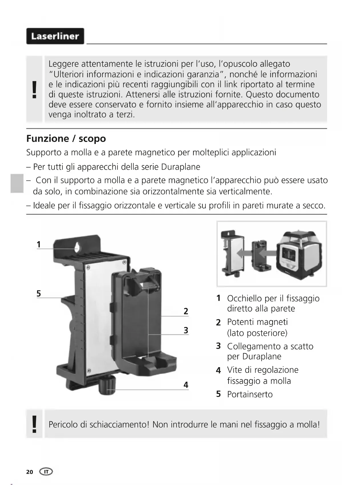 Funzione / scopo Supporto a molla e a parete magnetico per molteplici applicazioni – Per tutti gli apparecchi della serie Duraplane – Con il supporto a molla e a parete magnetico l‘apparecchio può essere usato da solo, in combinazione sia orizzontalmente sia verticalmente. – Ideale per il ssaggio orizzontale e verticale su proli in pareti murate a secco. Leggere attentamente le istruzioni per l‘uso, l’opuscolo allegato “Ulteriori informazioni e indicazioni garanzia”, nonché le informazioni e le indicazioni più recenti raggiungibili con il link riportato al termine di queste istruzioni. Attenersi alle istruzioni fornite. Questo documento deve essere conservato e fornito insieme all‘apparecchio in caso questo venga inoltrato a terzi.
