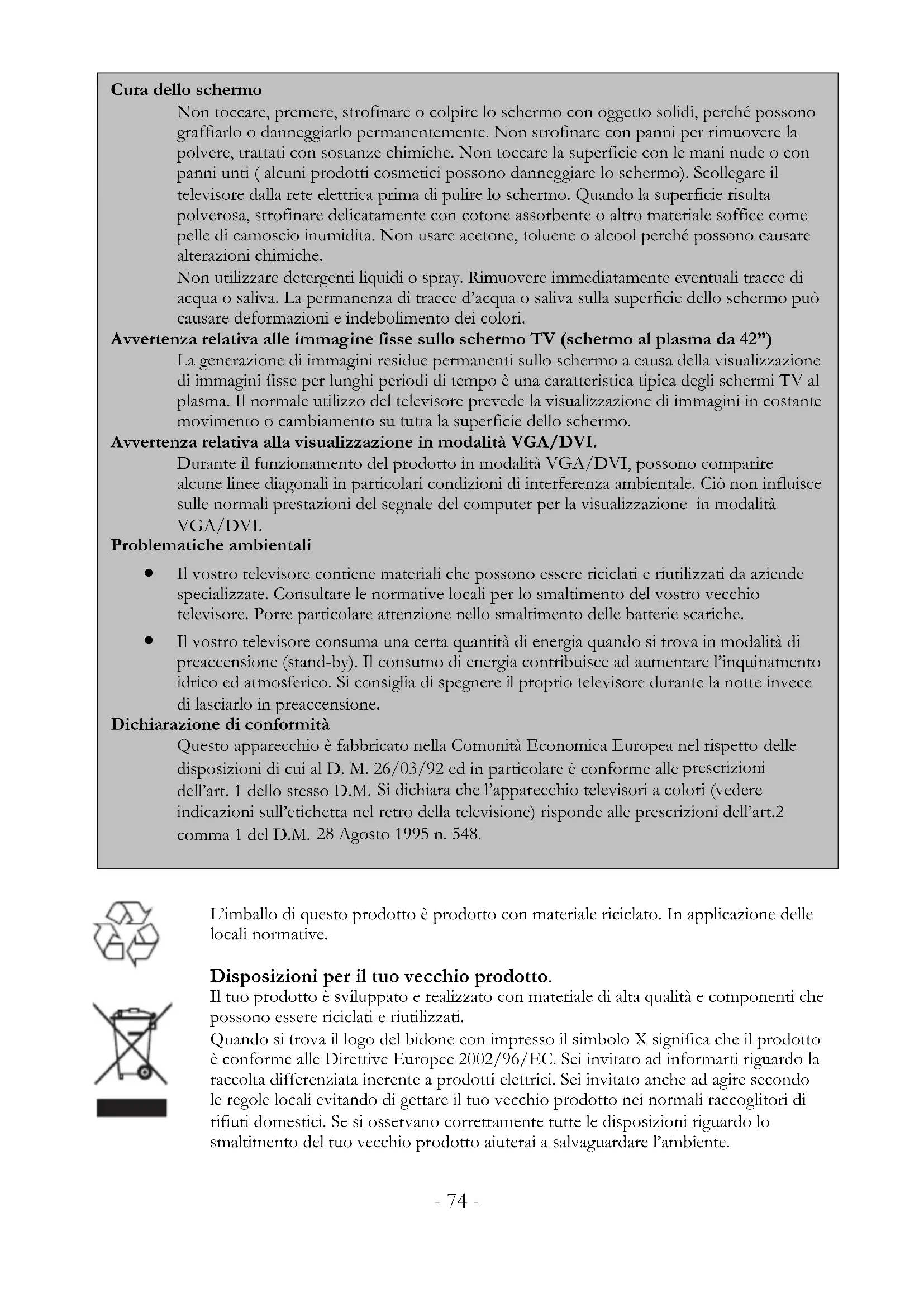 Il vostro televisore consuma una certa quantità di energia quando si trova in modalità di preaccensione (stand-by). Il consumo di energia contribuisce ad aumentare l’inquinamento idrico ed atmosferico. Si consiglia di spegnere il proprio televisore durante la notte invece di lasciarlo in preaccensione. Dichiarazione di conformità Questo apparecchio è fabbricato nella Comunità Economica Europea nel rispetto delle disposizioni di cui al D. M. 26/03/92 ed in particolare è conforme alle prescrizioni dell’art. 1 dello stesso D.M. Si dichiara che l’apparecchio televisori a colori (vedere indicazioni sull’etichetta nel retro della televisione) risponde alle prescrizioni dell’art.2 comma 1 del D.M. 28 Agosto 1995 n. 548. Disposizioni per il tuo vecchio prodotto. Il tuo prodotto è sviluppato e realizzato con materiale di alta qualità e componenti che possono essere riciclati e riutilizzati. Quando si trova il logo del bidone con impresso il simbolo X significa che il prodotto è conforme alle Direttive Europee 2002/96/EC. Sei invitato ad informarti riguardo la raccolta differenziata inerente a prodotti elettrici. Sei invitato anche ad agire secondo le regole locali evitando di gettare il tuo vecchio prodotto nei normali raccoglitori di rifiuti domestici. Se si osservano correttamente tutte le disposizioni riguardo lo smaltimento del tuo vecchio prodotto aiuterai a salvaguardare l’ambiente. L’imballo di questo prodotto è prodotto con materiale riciclato. In applicazione delle locali normative.