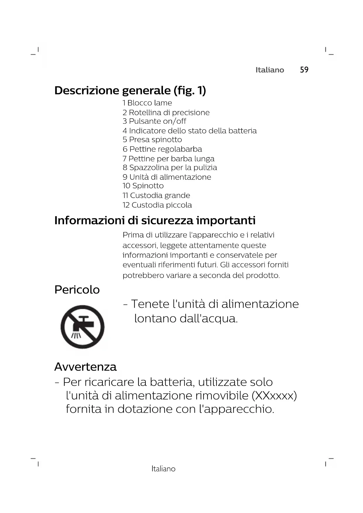 FrançaisItaliano Descrizione generale (fig. 1) 1 Blocco lame 2 Rotellina di precisione 3 Pulsante on/off 4 Indicatore dello stato della batteria 5 Presa spinotto 6 Pettine regolabarba 7 Pettine per barba lunga 8 Spazzolina per la pulizia 9 Unità di alimentazione 10 Spinotto 11 Custodia grande 12 Custodia piccola Informazioni di sicurezza importanti Prima di utilizzare l'apparecchio e i relativi accessori, leggete attentamente queste informazioni importanti e conservatele per eventuali riferimenti futuri. Gli accessori forniti potrebbero variare a seconda del prodotto. Pericolo - Tenete l'unità di alimentazione lontano dall'acqua. Avvertenza - Per ricaricare la batteria, utilizzate solo l'unità di alimentazione rimovibile (XXxxxx) fornita in dotazione con l'apparecchio.