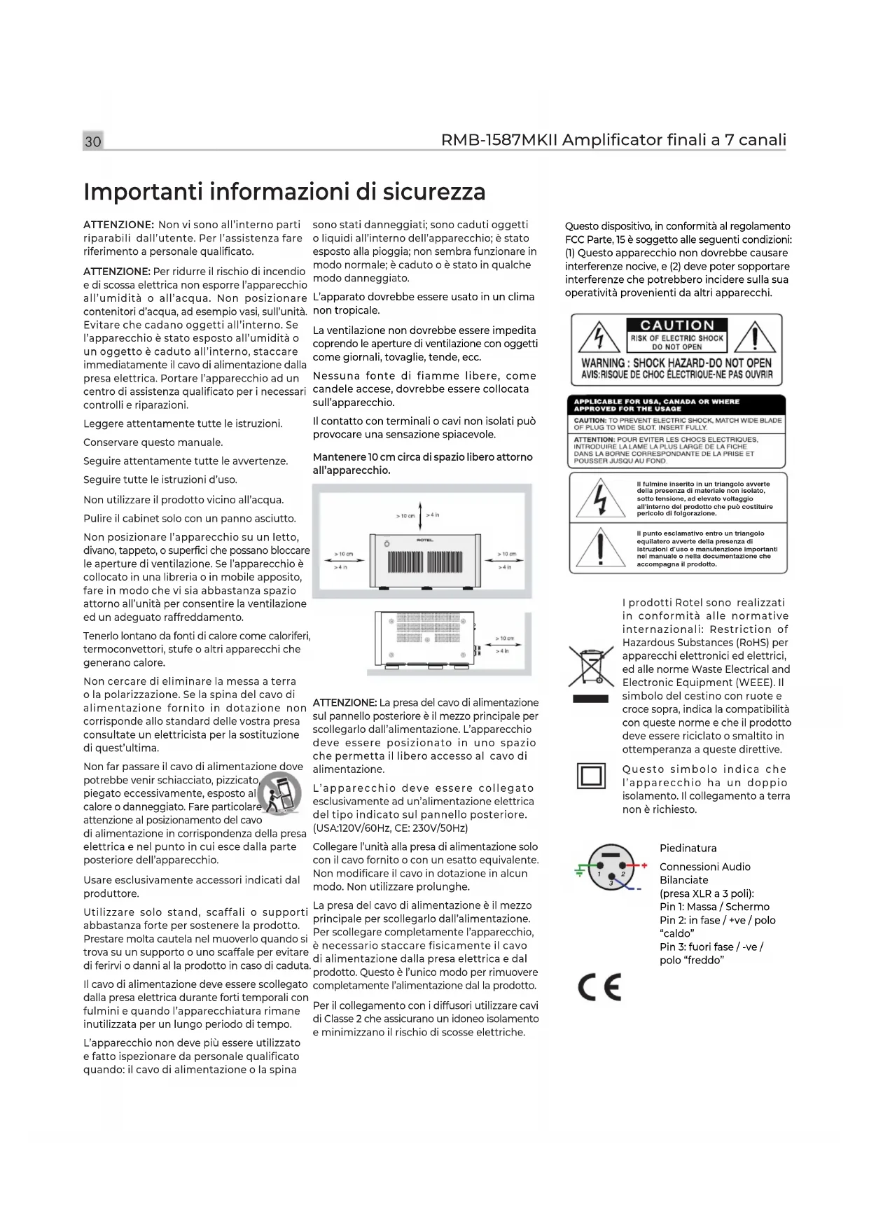 - Piedinatura Connessioni Audio Bilanciate (presa XLR a 3 poli): Pin 1: Massa / Schermo Pin 2: in fase / +ve / polo “caldo” Pin 3: fuori fase / -ve / polo “freddo” Importanti informazioni di sicurezza ATTENZIONE: Non vi sono all’interno parti riparabili dall’utente. Per l’assistenza fare riferimento a personale qualificato. ATTENZIONE: Per ridurre il rischio di incendio e di scossa elettrica non esporre l’apparecchio all’umidità o all’acqua. Non posizionare contenitori d’acqua, ad esempio vasi, sull’unità. Evitare che cadano oggetti all’interno. Se l’apparecchio è stato esposto all’umidità o un oggetto è caduto all’interno, staccare immediatamente il cavo di alimentazione dalla presa elettrica. Portare l’apparecchio ad un centro di assistenza qualificato per i necessari controlli e riparazioni. Leggere attentamente tutte le istruzioni. Conservare questo manuale. Seguire attentamente tutte le avvertenze. Seguire tutte le istruzioni d’uso. Non utilizzare il prodotto vicino all’acqua. Pulire il cabinet solo con un panno asciutto. Non posizionare l’apparecchio su un letto, divano, tappeto, o superfici che possano bloccare le aperture di ventilazione. Se l’apparecchio è collocato in una libreria o in mobile apposito, fare in modo che vi sia abbastanza spazio attorno all’unità per consentire la ventilazione ed un adeguato raffreddamento. Tenerlo lontano da fonti di calore come caloriferi, termoconvettori, stufe o altri apparecchi che generano calore. Non cercare di eliminare la messa a terra o la polarizzazione. Se la spina del cavo di alimentazione fornito in dotazione non corrisponde allo standard delle vostra presa consultate un elettricista per la sostituzione di quest’ultima. Non far passare il cavo di alimentazione dove potrebbe venir schiacciato, pizzicato, piegato eccessivamente, esposto al calore o danneggiato. Fare particolare attenzione al posizionamento del cavo di alimentazione in corrispondenza della presa elettrica e nel punto in cui esce dalla parte posteriore dell’apparecchio. Usare esclusivamente accessori indicati dal produttore. Utilizzare solo stand, scaffali o supporti abbastanza forte per sostenere la prodotto. Prestare molta cautela nel muoverlo quando si trova su un supporto o uno scaffale per evitare di ferirvi o danni al la prodotto in caso di caduta. Il cavo di alimentazione deve essere scollegato dalla presa elettrica durante forti temporali con fulmini e quando l’apparecchiatura rimane inutilizzata per un lungo periodo di tempo. L’apparecchio non deve più essere utilizzato e fatto ispezionare da personale qualificato quando: il cavo di alimentazione o la spina Questo dispositivo, in conformità al regolamento FCC Parte, 15 è soggetto alle seguenti condizioni: (1) Questo apparecchio non dovrebbe causare interferenze nocive, e (2) deve poter sopportare interferenze che potrebbero incidere sulla sua operatività provenienti da altri apparecchi. sono stati danneggiati; sono caduti oggetti o liquidi all’interno dell’apparecchio; è stato esposto alla pioggia; non sembra funzionare in modo normale; è caduto o è stato in qualche modo danneggiato. L’apparato dovrebbe essere usato in un clima non tropicale. La ventilazione non dovrebbe essere impedita coprendo le aperture di ventilazione con oggetti come giornali, tovaglie, tende, ecc. Nessuna fonte di fiamme libere, come candele accese, dovrebbe essere collocata sull’apparecchio. Il contatto con terminali o cavi non isolati può provocare una sensazione spiacevole.31 Italiano Alcune informazioni su Rotel La nostra storia ha avuto inizio quasi 60 anni fa. Nel corso del tempo abbiamo ricevuto centinaia di riconoscimenti per la qualità dei nostri prodotti e soddisfatto centinaia di migliaia di audioli ed amanti della musica. Proprio come voi! Rotel è stata fondata da una famiglia la cui passione per la musica ha portato alla realizzazione di componenti alta fedeltà di qualità senza compromessi. Attraverso gli anni questa passione non si è afevolita e l’obbiettivo di realizzare apparecchi di straordinario valore per veri audioli, indipendentemente dal loro budget, continua ad essere condiviso da tutti coloro che vi lavorano. I nostri progettisti operano in stretto contatto tra loro ascoltando ed afnando ogni nuovo prodotto no a raggiungere determinati standard qualitativi. Viene loro offerta una totale libertà di scelta sui componenti per ottenere le migliori prestazioni possibili. Non è raro quindi trovare in un Rotel condensatori di fabbricazione inglese o tedesca, semiconduttori giapponesi o americani, con la sola eccezione dei trasformatori di alimentazione, prodotti come tradizione nelle nostre fabbriche. Noi tutti abbiamo a cuore i temi dell’ambiente. Pensando al numero sempre crescente di apparecchi elettronici prodotti, è molto importante per un costruttore fare tutto il possibile afnché essi abbiano un minimo impatto sull’ambiente. Alla Rotel siamo orgogliosi di fare la nostra parte riducendo il contenuto di piombo nei nostri apparecchi rispettando rigorosamente la normativa RoHS. I nostri progettisti sono continuamente impegnati a migliorare l’efcienza dei prodotti senza per questo compromettere la loro qualità. Quando in standby, gli apparecchi assorbono una minima quantità di corrente così da soddisfare i requisiti dei più rigorosi standard sul consumo energetico. Anche le fabbriche Rotel contribuiscono ad aiutare l’ambiente attraverso continui progressi dei metodi di costruzione per arrivare a processi produttivi sempre più rispettosi dell’ambiente. Noi tutti di Rotel vi ringraziamo per aver acquistato questo prodotto che, siamo sicuri, vi accompagnerà per molti anni di puro divertimento e soddisfazione. Considerazioni sulla potenza d’uscita La potenza di uscita dell’RMB-1587MKII è indicata come 250 watt per ciascun canale su 4 ohm, quando sette canali funzionano insieme a piena potenza. Quando si comparano le c