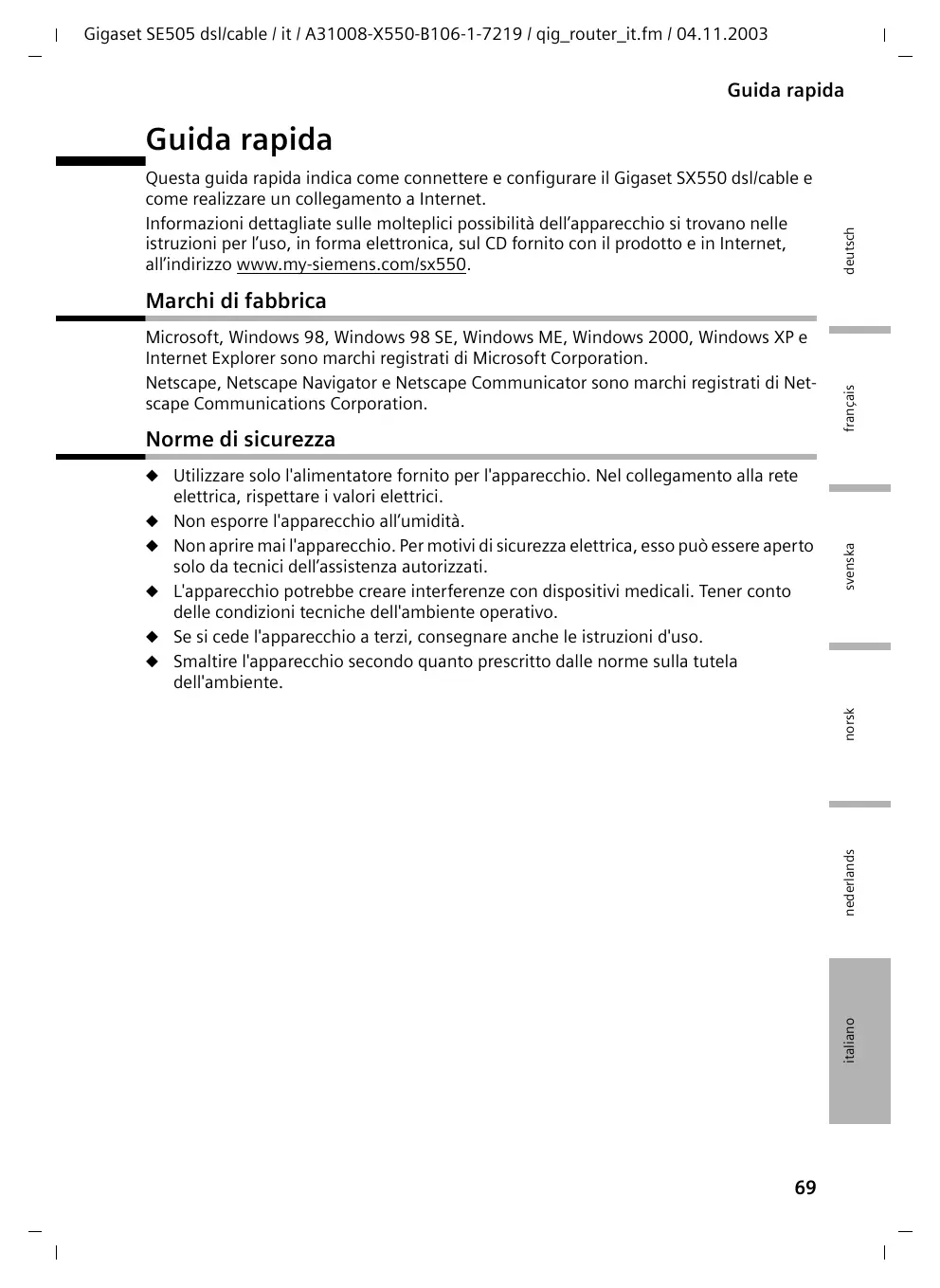 Gigaset SE505 dsl/cable / it / A31008-X550-B106-1-7219 / qig_router_it.fm / 04.11.2003 Guida rapida svenska français Per poter realizzare un collegamento a Internet mediante il Gigaset SX550 dsl/cable, è necessario configurare la connessione a Internet. A questo scopo il Gigaset SX550 dsl/ cable mette a disposizione un'interfaccia operativa richiamabile mediante un browser Web. Procedere come segue: