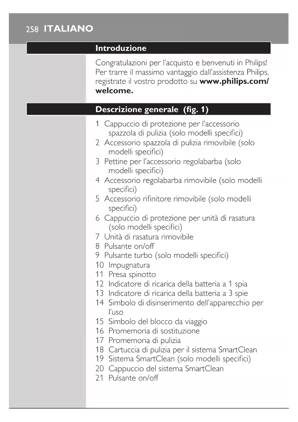 Tenete premuto il pulsante on/off per 3 secondi. - Il simbolo del blocco da viaggio lampeggia e quindi si accende sso. Il rasoio è di nuovo pronto per l’uso. Sostituzione delle testine di rasatura Per ottenere prestazioni di rasatura ottimali, vi consigliamo di sostituire le testine di rasatura ogni due anni. - L’apparecchio è dotato di un promemoria di sostituzione per ricordarvi di sostituire le testine di rasatura. Il promemoria di sostituzione si accende a luce ssa. Nota: dopo aver sostituito le testine di rasatura, ripristinate il promemoria di sostituzione premendo il pulsante on/off per 7 secondi. Impostazioni Turbo (solo modelli specici) L’apparecchio è dotato dell’impostazione Turbo o Turbo+. Tale impostazione offre una rasatura più rapida e accurata anche delle zone più difcili da raggiungere. 3 sec. ITALIANO 265Attivazione dell’impostazione Turbo 1 Per attivare l’impostazione Turbo, premete una volta il pulsante turbo. Disattivazione dell’impostazione Turbo 1 Per disattivare l’impostazione Turbo, premete di nuovo il pulsante turbo. Come ricaricare l’apparecchio La ricarica richiede circa 1 ora. Nota: questo apparecchio può essere utilizzato solo senza lo. Il rasoio deve essere caricato prima di utilizzarlo per la prima volta e quando il display indica che la batteria è quasi scarica. Carica tramite adattatore 1 Inserite lo spinotto nella presa dell’apparecchio e l’adattatore nella presa di corrente. Ricarica tramite sistema SmartClean (solo per modelli specici) 1 Collegate lo spinotto al sistema SmartClean. 2 Inserite la spina dell’adattatore nella presa di corrente a muro. ITALIANO2663 Premete il coperchio superiore per inserire il rasoio nel supporto no a farlo scattare in posizione. 4 Tenete il rasoio elettrico capovolto sopra il supporto. Assicuratevi che la parte anteriore del rasoio sia rivolta verso il sistema SmartClean. 5 Posizionate il rasoio nel supporto, inclinate il rasoio all’indietro e premete verso il basso il coperchio superiore per collegare il rasoio no a farlo scattare in posizione. - Il simbolo della batteria lampeggia lentamente a indicare che il rasoio è in fase di ricarica. Modalità d’uso del rasoio Accensione e spegnimento dell’apparecchio 1 Per accendere l’apparecchio, premete una volta il pulsante on/off. 2 Per spegnere l’apparecchio, premete una volta il pulsante on/off. - Indicatore di ricarica della batteria a 3 spie: il display si illumina per alcuni secondi per visualizzare l’autonomia residua della batteria. ITALIANO 267Rasatura Periodo di adattamento sulla pelle Le prime rasature potrebbero non avere il risultato che vi aspettate e la vostra pelle potrebbe anche irritarsi un po’. Questo è normale. La pelle e la barba hanno bisogno di tempo per adattarsi a qualunque nuovo sistema di rasatura. Vi consigliamo una rasatura regolare (almeno 3 volte a settimana) utilizzando questo rasoio per un periodo di 3 settimane per consentire alla pelle di adattarsi al nuovo rasoio. Nota: questo apparecchio può essere utilizzato solo senza lo. 1 Accendete l’apparecchio. 2 Fate scorrere le testine di rasatura sulla pelle, compiendo movimenti circolari. Nota: non fate movimenti lineari. 3 Pulite il rasoio dopo ogni uso (vedere il capitolo “Pulizia e manutenzione”). Rasatura su pelle bagnata Potete usare questo rasoio anche sotto la doccia o sul volto ricoperto di schiuma da barba o gel per la rasatura. Per radersi con la schiuma da barba o il gel per la rasatura, seguite i passaggi riportati sotto: 1 Bagnate la pelle. 2 Applicate quindi la schiuma da barba o il gel per la rasatura. ITALIANO2683 Bagnate l’unità di rasatura sotto il rubinetto per fare in modo che l’unità di rasatura scorra facilmente sulla vostra pelle. 4 Accendete il rasoio. 5 Fate scorrere le testine di rasatura sulla pelle, compiendo movimenti circolari. Nota: Risciacquate il rasoio sotto il rubinetto regolarmente per mantenere una perfetta scorrevolezza sulla pelle. 6 Asciugate il viso e pulite a fondo il rasoio dopo l’uso (vedere il capitolo “Pulizia e manutenzione”). Nota: Rimuovete con cura tutta la schiuma o il gel dal rasoio. Impostazioni Turbo (solo modelli specici) L’apparecchio è dotato dell’impostazione Turbo o Turbo+ per una rasatura più semplice delle zone più difcili da raggiungere. 1 Accendete il rasoio. 2 Per attivare l’impostazione Turbo e raggiungere le zone più difcili con più rapidità, premete una volta il pulsante turbo. 3 Fate scorrere le testine di rasatura sulla pelle, compiendo movimenti circolari. Nota: Non fate movimenti lineari. 4 Per disattivare l’impostazione Turbo, premete una volta il relativo pulsante. ITALIANO 269Uso degli accessori rimovibili Nota: Gli accessori forniti potrebbero essere diversi in base ai prodotti. La confezione mostra gli accessori forniti con l’apparecchio. Rimozione o inserimento degli accessori 1 Controllate che l’apparecchio sia spento. 2 Estraete l’accessorio dall’apparecchio. Nota: Non girate l’accessorio mentre lo estraete dall’apparecchio. 3 Inserite la linguetta dell’accessorio nella fessura sulla parte superiore dell’apparecchio. Quindi, premete l’accessorio verso il basso no a farlo scattare in posizione sull’apparecchio. Uso del rinitore Potete utilizzare il rinitore per regolare basette e baf. 1 Controllate che l’apparecchio sia spento. 2 Inserite la linguetta dell’accessorio nella fessura sulla parte superiore del rasoio. Quindi, premete l’accessorio rinitore verso il basso no a farlo scattare in posizione sull’apparecchio. 3 Accendete l’apparecchio. 4 A questo punto, potete iniziare a rinire la barba. 5 Pulite l’accessorio dopo l’uso (vedere il capitolo “Pulizia e manutenzione”). Uso dell’accessorio regolabarba 1 Controllate che l’apparecchio sia spento. ITALIANO2702 Inserite la linguetta dell’accessorio nella fessura sulla parte superiore dell’apparecchio. Quindi, premete l’accessorio verso il basso 