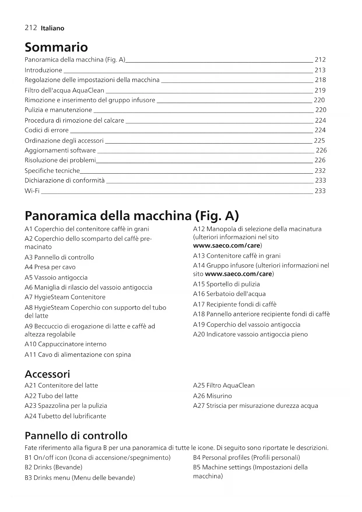Italiano Sommario Panoramica della macchina (Fig. A)__________________________________________________________ 212 Introduzione _____________________________________________________________________________ 213 Regolazione delle impostazioni della macchina _______________________________________________ 218 Filtro dell'acqua AquaClean ________________________________________________________________ 219 Rimozione e inserimento del gruppo infusore ________________________________________________ 220 Pulizia e manutenzione ____________________________________________________________________ 220 Procedura di rimozione del calcare __________________________________________________________ 224 Codici di errore ___________________________________________________________________________ 224 Ordinazione degli accessori ________________________________________________________________ 225 Aggiornamenti software ___________________________________________________________________ 226 Risoluzione dei problemi___________________________________________________________________ 226 Specifiche tecniche________________________________________________________________________ 232 Dichiarazione di conformità ________________________________________________________________ 233 Wi-Fi ____________________________________________________________________________________ 233 Panoramica della macchina (Fig. A) A1 Coperchio del contenitore caffè in grani A2 Coperchio dello scomparto del caffè pre- macinato A3 Pannello di controllo A4 Presa per cavo A5 Vassoio antigoccia A6 Maniglia di rilascio del vassoio antigoccia A7 HygieSteam Contenitore A8 HygieSteam Coperchio con supporto del tubo del latte A9 Beccuccio di erogazione di latte e caffè ad altezza regolabile A10 Cappuccinatore interno A11 Cavo di alimentazione con spina A12 Manopola di selezione della macinatura (ulteriori informazioni nel sito www.saeco.com/care) A13 Contenitore caffè in grani A14 Gruppo infusore (ulteriori informazioni nel sito www.saeco.com/care) A15 Sportello di pulizia A16 Serbatoio dell'acqua A17 Recipiente fondi di caffè A18 Pannello anteriore recipiente fondi di caffè A19 Coperchio del vassoio antigoccia A20 Indicatore vassoio antigoccia pieno Accessori A21 Contenitore del latte A22 Tubo del latte A23 Spazzolina per la pulizia A24 Tubetto del lubrificante A25 Filtro AquaClean A26 Misurino A27 Striscia per misurazione durezza acqua Pannello di controllo Fate riferimento alla figura B per una panoramica di tutte le icone. Di seguito sono riportate le descrizioni. B1 On/off icon (Icona di accensione/spegnimento) B2 Drinks (Bevande) B3 Drinks menu (Menu delle bevande) B4 Personal profiles (Profili personali) B5 Machine settings (Impostazioni della macchina)213 Italiano B6 Status menu (Menu di stato) B7 Negozio B8 Start/stop icon (Icona di avvio/arresto) Introduzione Congratulazioni per l'acquisto della macchina per caffè superautomatica Saeco! Per trarre il massimo vantaggio dal supporto online offerto da Saeco, potete utilizzare il pannello di controllo per registrare la vostra macchina tramite la connessione Wi-Fi integrata oppure accedere al sito www.saeco.com/MyCoffeeMachine e registrare lì il vostro prodotto. Prima di utilizzare la macchina per la prima volta, leggete attentamente l'opuscolo sulla sicurezza fornito a parte e conservatelo per eventuali riferimenti futuri. La macchina da caffè Saeco completamente automatica vi consente di connettervi alla vostra rete Wi-Fi per godere di un'esperienza migliore. Connettendo la macchina alla vostra rete Wi-Fi, sarete in grado di: