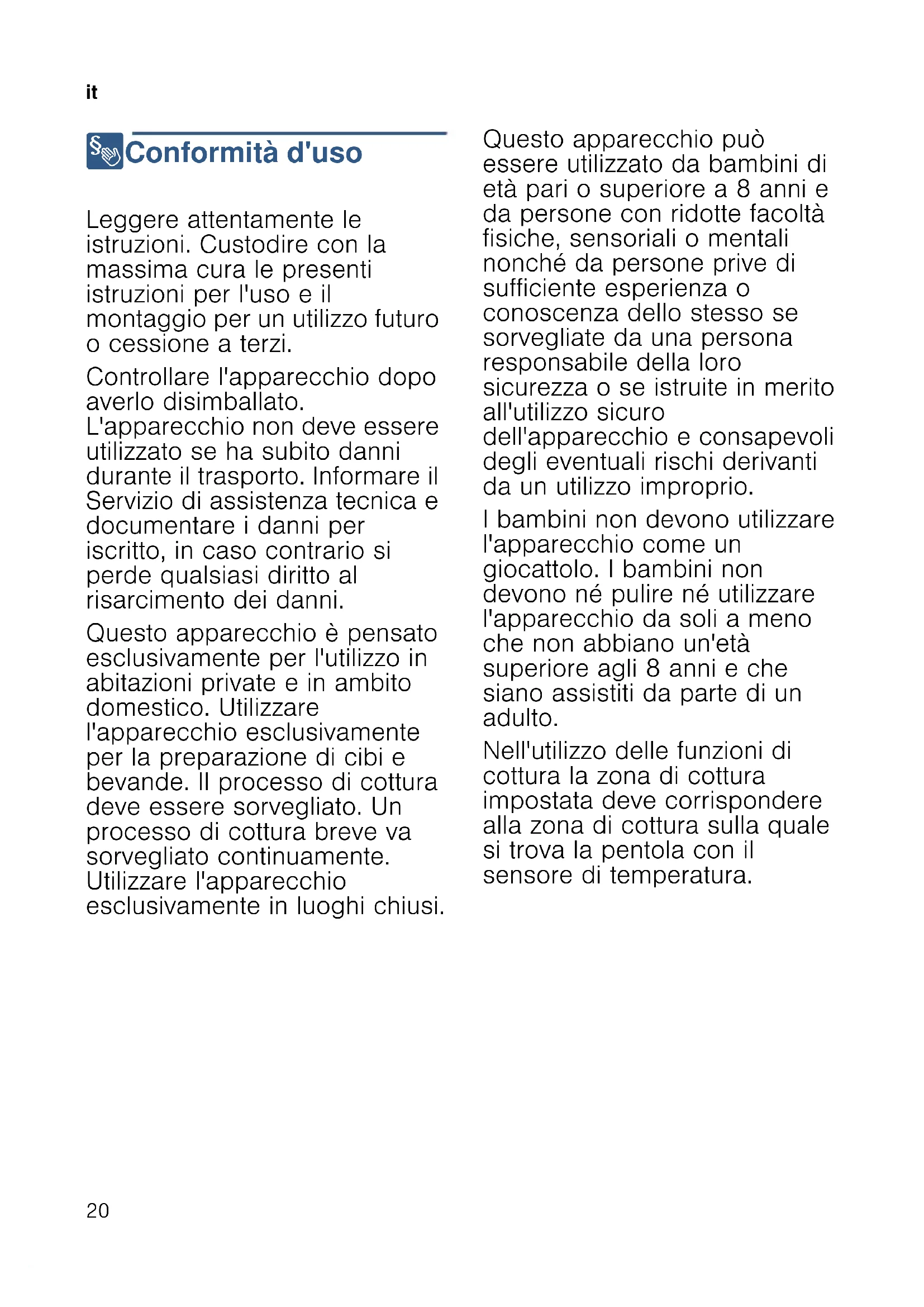 8 Conformità d'uso Conf or mità d' us o Leggere attentamente le istruzioni. Custodire con la massima cura le presenti istruzioni per l'uso e il montaggio per un utilizzo futuro o cessione a terzi. Controllare l'apparecchio dopo averlo disimballato. L'apparecchio non deve essere utilizzato se ha subito danni durante il trasporto. Informare il Servizio di assistenza tecnica e documentare i danni per iscritto, in caso contrario si perde qualsiasi diritto al risarcimento dei danni. Questo apparecchio è pensato esclusivamente per l'utilizzo in abitazioni private e in ambito domestico. Utilizzare l'apparecchio esclusivamente per la preparazione di cibi e bevande. Il processo di cottura deve essere sorvegliato. Un processo di cottura breve va sorvegliato continuamente. Utilizzare l'apparecchio esclusivamente in luoghi chiusi. Questo apparecchio può essere utilizzato da bambini di età pari o superiore a 8 anni e da persone con ridotte facoltà fisiche, sensoriali o mentali nonché da persone prive di sufficiente esperienza o conoscenza dello stesso se sorvegliate da una persona responsabile della loro sicurezza o se istruite in merito all'utilizzo sicuro dell'apparecchio e consapevoli degli eventuali rischi derivanti da un utilizzo improprio. I bambini non devono utilizzare l'apparecchio come un giocattolo. I bambini non devono né pulire né utilizzare l'apparecchio da soli a meno che non abbiano un'età superiore agli 8 anni e che siano assistiti da parte di un adulto. Nell'utilizzo delle funzioni di cottura la zona di cottura impostata deve corrispondere alla zona di cottura sulla quale si trova la pentola con il sensore di temperatura.it