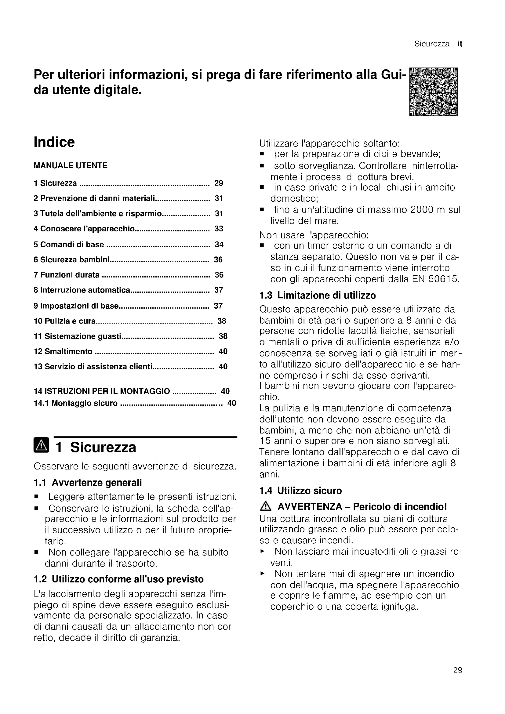 1 Sicurezza Osservare le seguenti avvertenze di sicurezza. 1.1 Avvertenze generali ¡ Leggere attentamente le presenti istruzioni. ¡ Conservare le istruzioni, la scheda dell'ap- parecchio e le informazioni sul prodotto per il successivo utilizzo o per il futuro proprie- tario. ¡ Non collegare l'apparecchio se ha subito danni durante il trasporto. 1.2 Utilizzo conforme all'uso previsto L'allacciamento degli apparecchi senza l'im- piego di spine deve essere eseguito esclusi- vamente da personale specializzato. In caso di danni causati da un allacciamento non cor- retto, decade il diritto di garanzia. Utilizzare l'apparecchio soltanto: ¡ per la preparazione di cibi e bevande; ¡ sotto sorveglianza. Controllare ininterrotta- mente i processi di cottura brevi. ¡ in case private e in locali chiusi in ambito domestico; ¡ fino a un'altitudine di massimo 2000m sul livello del mare. Non usare l'apparecchio: ¡ con un timer esterno o un comando a di- stanza separato. Questo non vale per il ca- so in cui il funzionamento viene interrotto con gli apparecchi coperti dalla EN50615. 1.3 Limitazione di utilizzo Questo apparecchio può essere utilizzato da bambini di età pari o superiore a 8 anni e da persone con ridotte facoltà fisiche, sensoriali o mentali o prive di sufficiente esperienza e/o conoscenza se sorvegliati o già istruiti in meri- to all'utilizzo sicuro dell'apparecchio e se han- no compreso i rischi da esso derivanti. I bambini non devono giocare con l'apparec- chio. La pulizia e la manutenzione di competenza dell’utente non devono essere eseguite da bambini, a meno che non abbiano un’età di 15 anni o superiore e non siano sorvegliati. Tenere lontano dall'apparecchio e dal cavo di alimentazione i bambini di età inferiore agli 8 anni. 1.4 Utilizzo sicuro AVVERTENZA‒Pericolo di incendio! Una cottura incontrollata su piani di cottura utilizzando grasso e olio può essere pericolo- so e causare incendi. ▶ Non lasciare mai incustoditi oli e grassi ro- venti. ▶ Non tentare mai di spegnere un incendio con dell'acqua, ma spegnere l'apparecchio e coprire le fiamme, ad esempio con un coperchio o una coperta ignifuga.it Sicurezza