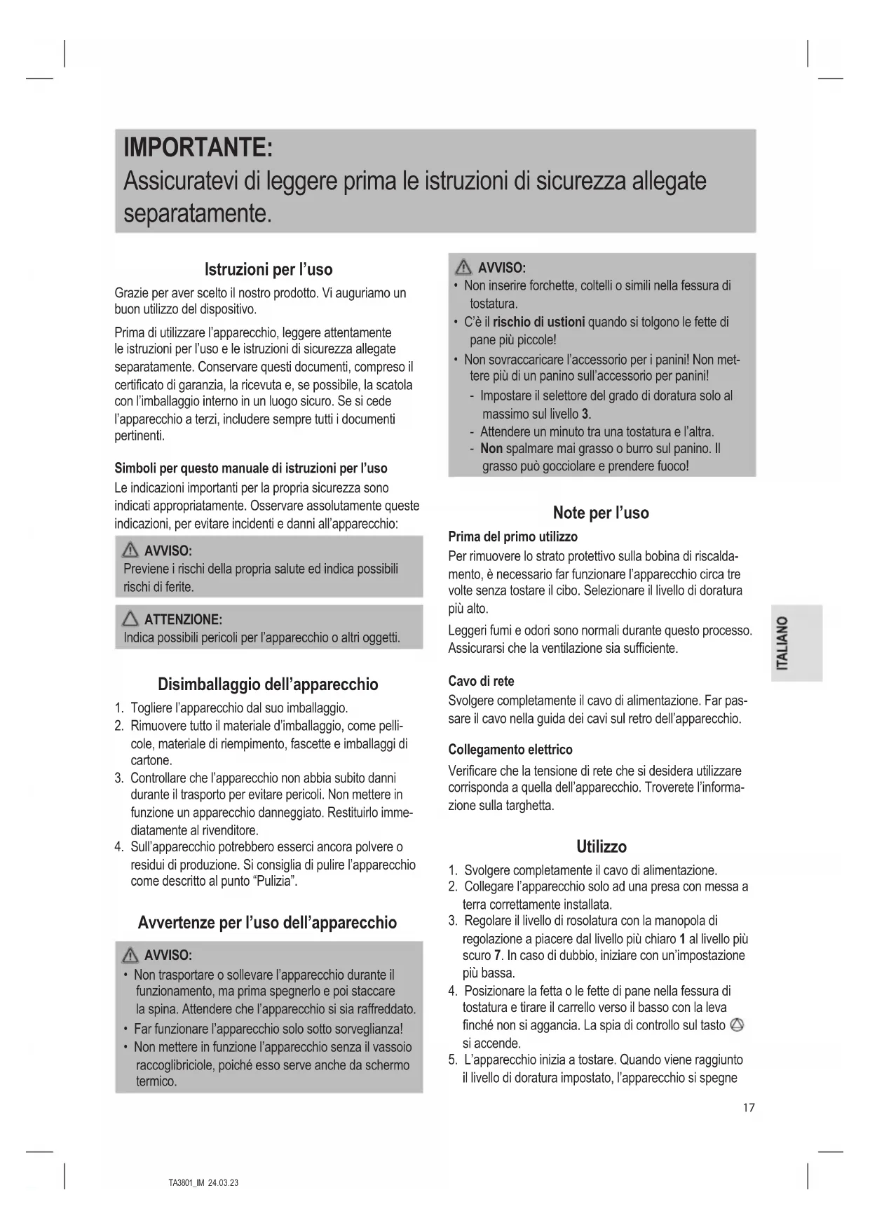 Risoluzione dei problemi Problema Possibile causa Rimedio L’apparecchio non fun- ziona. L’apparecchio non ha alimentazione. Controllare la presa di corrente con un altro apparecchio. Inserire correttamente la spina di rete. Controllare il fusibile di casa. L’apparecchio è difettoso. Contattare il nostro servizio o uno specialista. Il pane diventa troppo scuro. Il livello di tostatura è troppo alto. Selezionare un livello di tostatura più basso. Il pane è troppo chiaro. Il livello di tostatura è stato impostato troppo basso. Selezionare un livello di tostatura più alto Il cursore di tostatura non si muove più verso l’alto. Una fetta di pane si è bloccata nello scivolo. AVVISO: Staccare la spina dalla presa di corrente! Lasciare raffreddare l’apparecchio! Liberare la fetta di pane con un oggetto isolato, per esempio un bastone di legno. Se neces- sario, girare il tostapane in modo che la fetta di pane cada. Dati tecnici Modello: ......................................................................TA 3801 Alimentazione:....................................220 – 240 V~, 50 / 60 Hz Consumo di energia: ............................................ 650 – 750 W Classe di protezione: ............................................................. Peso netto: ...............................................................ca. 0,9 kg Si riserva il diritto di apportare modiche tecniche e di design nel corso dello sviluppo del prodotto. Questo apparecchio è stato testato secondo tutte le direttive CE in vigore e costruito secondo le ultime norme di sicurezza. Smaltimento Significato del simbolo “Eliminazione” Salvaguardare l’ambiente, gli elettrodomestici non vanno eliminati come riuti domestici. Per l’eliminazione degli elettrodomestici, fare uso dei posti di raccolta previsti per questo tipo e porre quegli elettrodomestici che non sono più in uso. Si contribuisce così ad evitare un effetto potenziale sull’am- biente e sulla salute, dovuto magari ad una eliminazione sbagliata. Questo signica un contributo personale alla riutilizzazione, al riciclaggio e altre forme di utilizzazione di elettrodomestici ed apparecchi elettronici usati. Si possono trovare le corrispondenti informazioni sugli appositi luoghi di raccolta, nelle amministrazioni dei comuni. Il vostro rivenditore e partner contrattuale è anche obbligato a riprendere gratuitamente il vecchio apparecchio.TA3801_IM 24.03.23