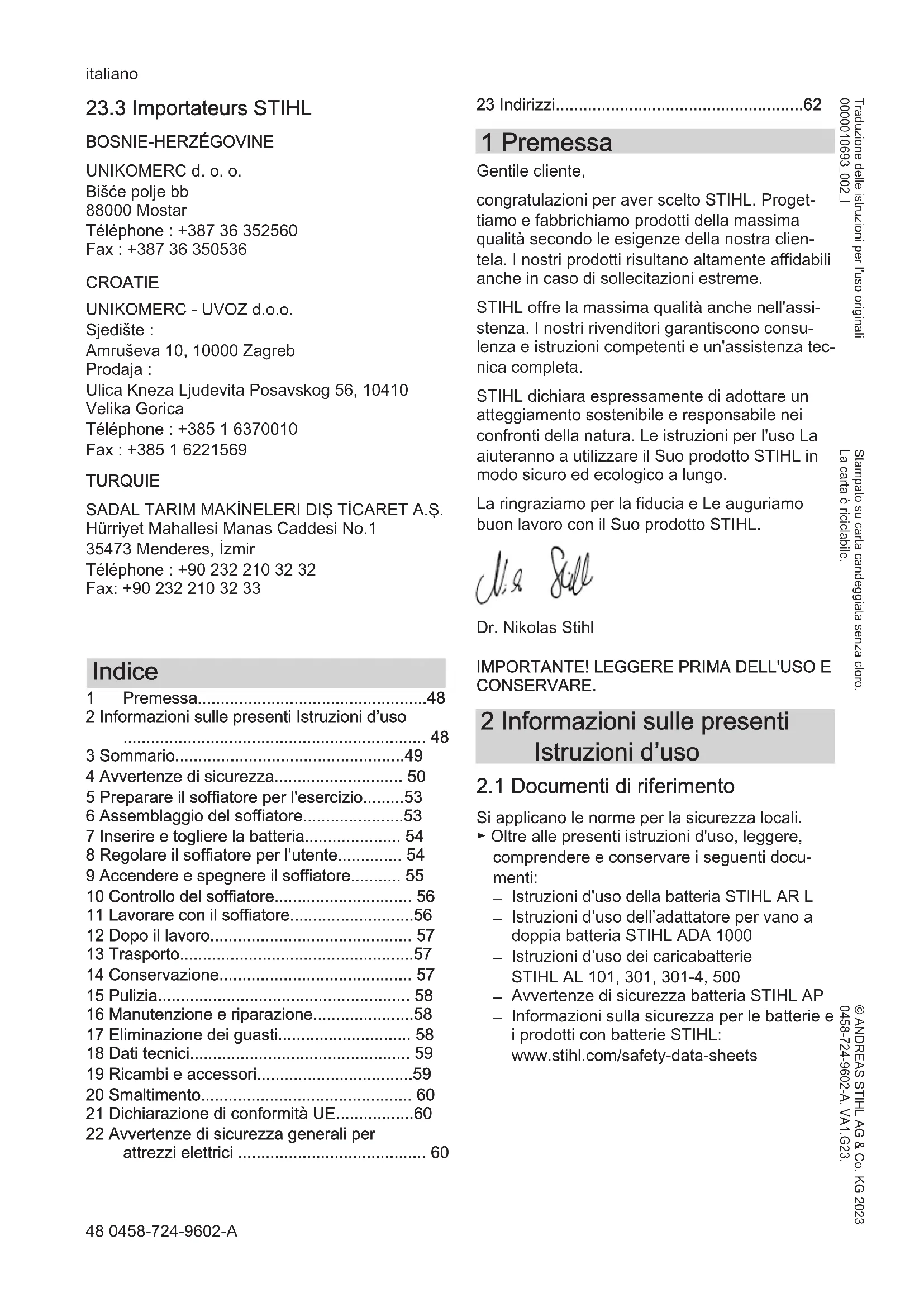 - 23 Indirizzi 1 Premessa Gentile cliente, congratulazioni per aver scelto STIHL. Proget‐ tiamo e fabbrichiamo prodotti della massima qualità secondo le esigenze della nostra clien‐ tela. I nostri prodotti risultano altamente affidabili anche in caso di sollecitazioni estreme. STIHL offre la massima qualità anche nell'assi‐ stenza. I nostri rivenditori garantiscono consu‐ lenza e istruzioni competenti e un'assistenza tec‐ nica completa. STIHL dichiara espressamente di adottare un atteggiamento sostenibile e responsabile nei confronti della natura. Le istruzioni per l'uso La aiuteranno a utilizzare il Suo prodotto STIHL in modo sicuro ed ecologico a lungo. La ringraziamo per la fiducia e Le auguriamo buon lavoro con il Suo prodotto STIHL. Dr. Nikolas Stihl p. 62