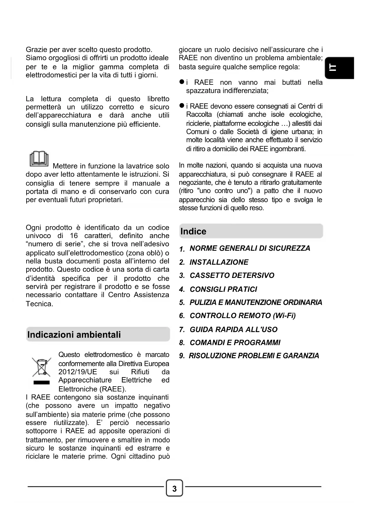 Mettere in funzione la lavatrice solo dopo aver letto attentamente le istruzioni. Si consiglia di tenere sempre il manuale a portata di mano e di conservarlo con cura per eventuali futuri proprietari.