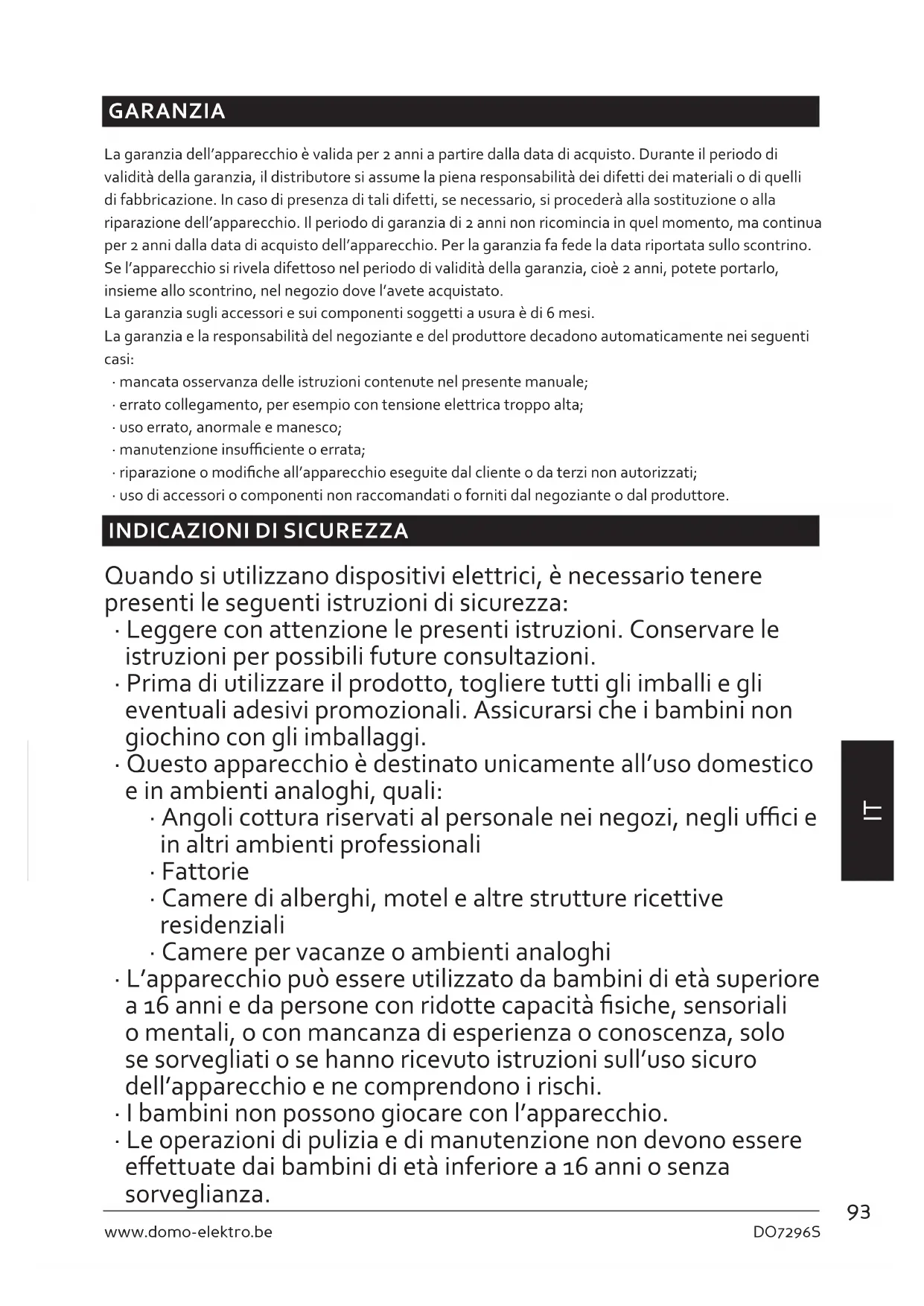 MISURE AMBIENTALI Il simbolo sul prodotto o sulla confezione indica che esso non deve essere trattato come riuto domestico. Deve, al contrario, essere conferito al punto di raccolta predisposto per il riciclo delle apparecchiature elettriche ed elettroniche. Facendo in modo che questo prodotto venga smaltito correttamente aiuterete a prevenire potenziali conseguenze negative per l’ambiente e la salute dell’uomo, che potrebbero essere causate da uno smaltimento non corretto. Per maggiori informazioni sul riciclo di questo prodotto, consultare le autorità comunali, l’azienda o il servizio responsabili della raccolta dei riuti domestici o il negozio in cui il prodotto è stato acquistato. Il materiale di imballaggio è riciclabile. Lo smaltimento dell’imballaggio deve avvenire al ne di tutelare l’ambiente. BATTERIA RIMOVIBILE L’apparecchio funziona con una batteria che anche dopo l’utilizzo non può essere smaltita con i riuti domestici. È possibile portare l’apparecchio presso un centro di raccolta per apparecchiature elettriche in disuso della propria zona (isola ecologica, esercizio commerciale di settore...). Le batterie contengono sostanze pericolose per la salute delle persone e per l’ambiente. Rimuovere la batteria dall’apparecchio prima di smaltire come descritto in queste istruzioni per l’uso. Riciclare la batteria in conformità con le normative e i regolamenti locali. Non perforare mai la batteria e non esporla a temperature elevate: può esplodere. In circostanze estreme possono vericarsi perdite dalla batteria. Se il liquido entra in contatto con la pelle, lavare immediatamente la pelle con acqua e sapone o neutralizzare con un acido delicato come del succo di limone o aceto. Se il liquido entra in contatto con gli occhi, lavare gli occhi con abbondante acqua per almeno 10 minuti e contattare un medico.111 DO7296S www.domo-elektro.be