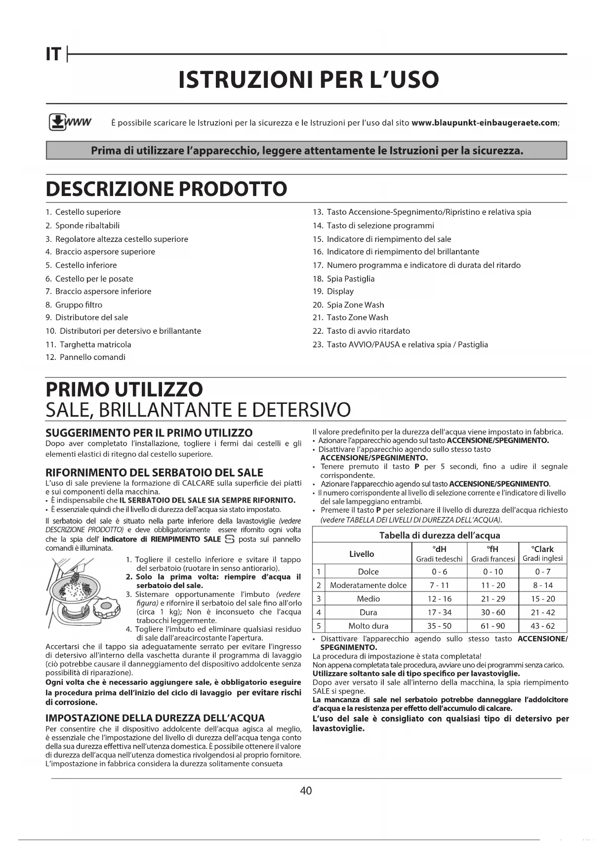 - Disattivare l’apparecchio agendo sullo stesso tasto ACCENSIONE/ SPEGNIMENTO.La procedura di impostazione è stata completata!Non appena completata tale procedura, avviare uno dei programmi senza carico.Utilizzare soltanto sale di tipo specico per lavastoviglie.Dopo aver versato il sale all’interno della macchina, la spia riempimento SALE si spegne.La mancanza di sale nel serbatoio potrebbe danneggiare l’addolcitore d’acqua e la resistenza per eetto dell’accumulo di calcare.L’uso del sale è consigliato con qualsiasi tipo di detersivo per lavastoviglie. È possibile scaricare le Istruzioni per la sicurezza e le Istruzioni per l’uso dal sito www.blaupunkt-einbaugeraete.com;41