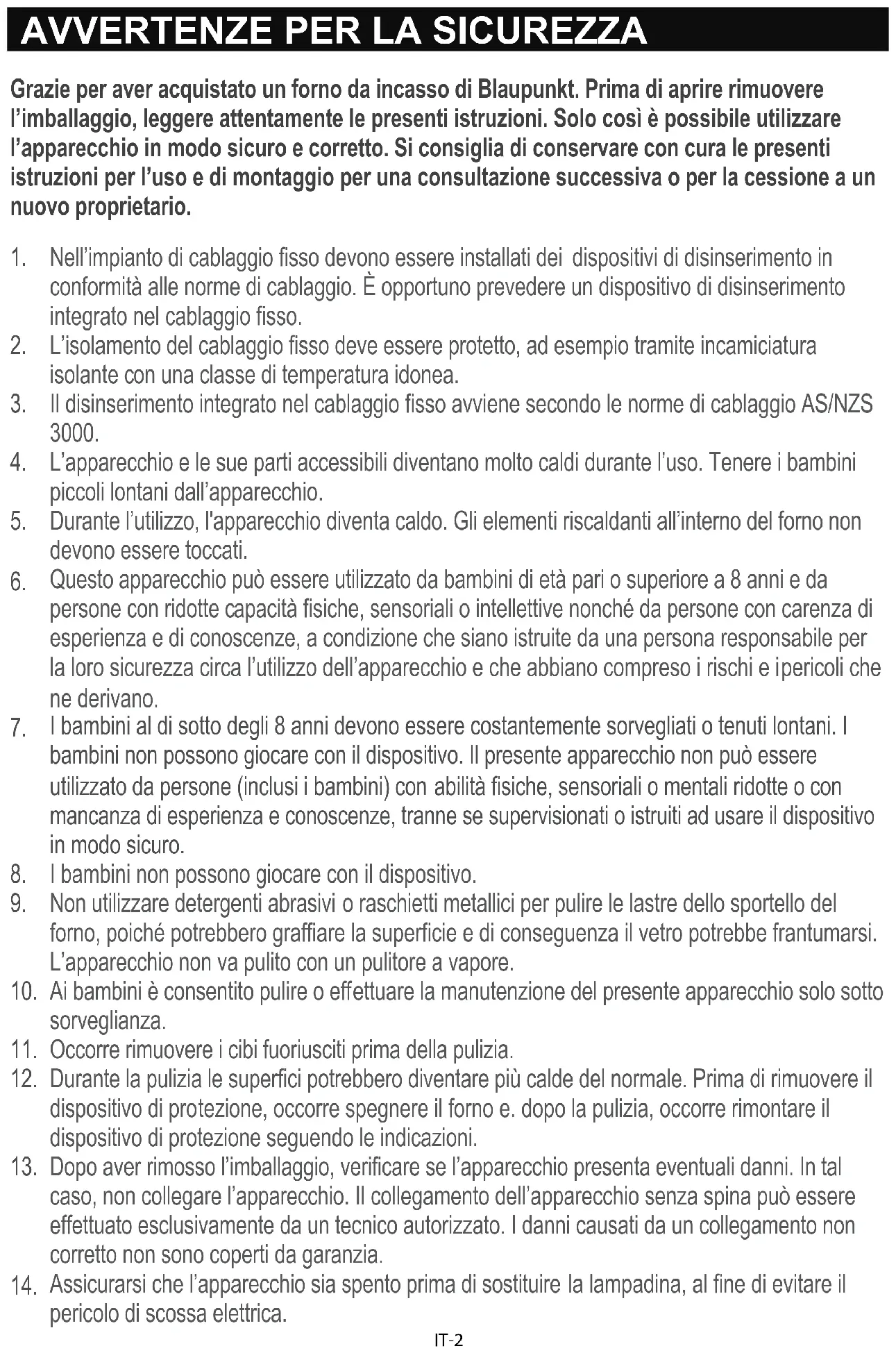 35 SCHEDA TECNICA (UE 65/2014 & UE 66/2014)AVVERTENZE PER LA SICUREZZA Grazie per aver acquistato un forno da incasso di Blaupunkt. Prima di aprire rimuovere l’imballaggio, leggere attentamente le presenti istruzioni. Solo così è possibile utilizzare l’apparecchio in modo sicuro e corretto. Si consiglia di conservare con cura le presenti istruzioni per l’uso e di montaggio per una consultazione successiva o per la cessione a un nuovo proprietario.