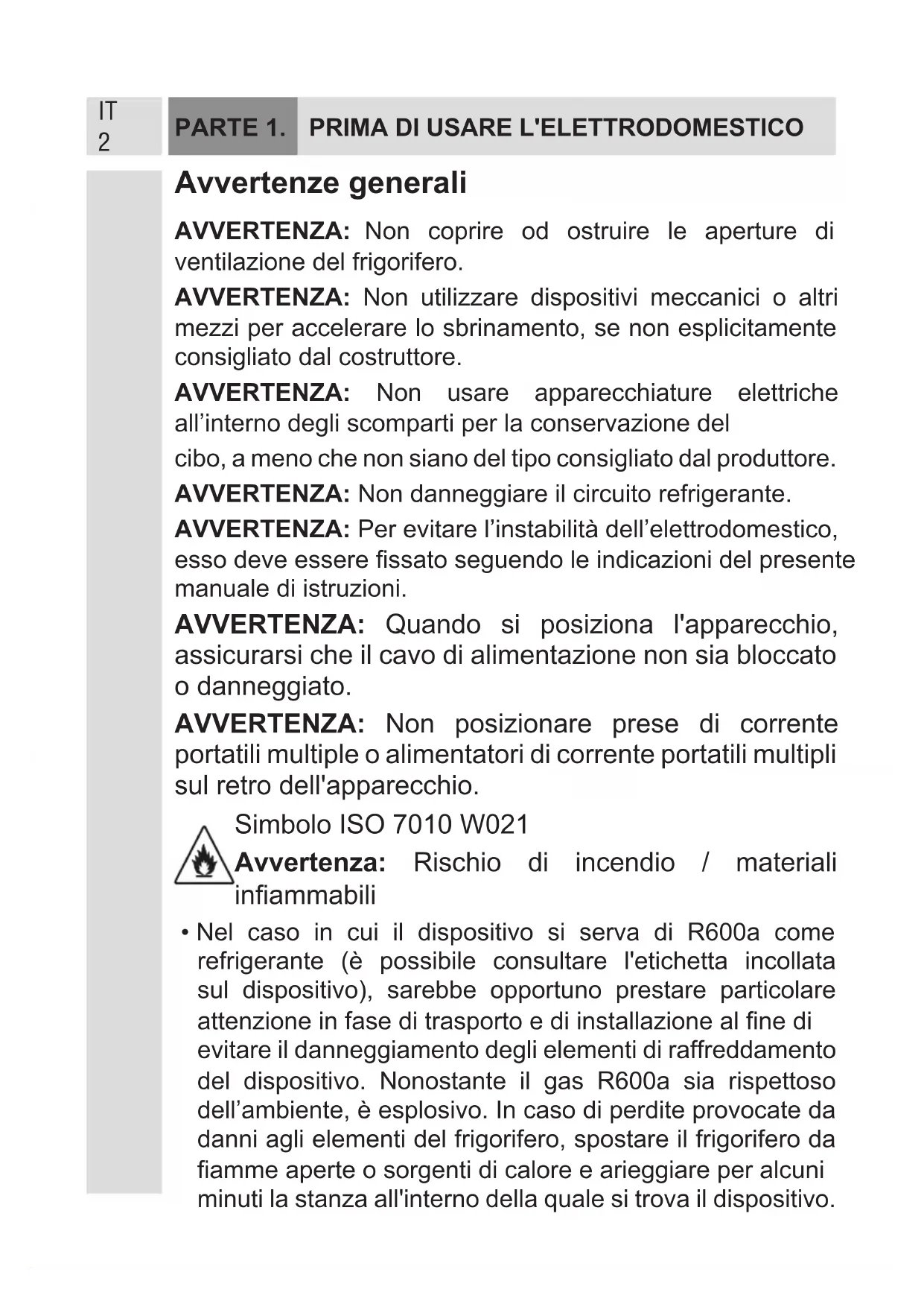 Avvertenze generali AVVERTENZA: Non coprire od ostruire le aperture di ventilazione del frigorifero. AVVERTENZA: Non utilizzare dispositivi meccanici o altri mezzi per accelerare lo sbrinamento, se non esplicitamente consigliato dal costruttore. AVVERTENZA: Non usare apparecchiature elettriche all’interno degli scomparti per la conservazione del cibo, a meno che non siano del tipo consigliato dal produttore. AVVERTENZA: Non danneggiare il circuito refrigerante. AVVERTENZA: Per evitare l’instabilità dell’elettrodomestico, esso deve essere ssato seguendo le indicazioni del presente manuale di istruzioni. AVVERTENZA: Quando si posiziona l'apparecchio, assicurarsi che il cavo di alimentazione non sia bloccato o danneggiato. AVVERTENZA: Non posizionare prese di corrente portatili multiple o alimentatori di corrente portatili multipli sul retro dell'apparecchio. Simbolo ISO 7010 W021 Avvertenza: Rischio di incendio / materiali inammabili