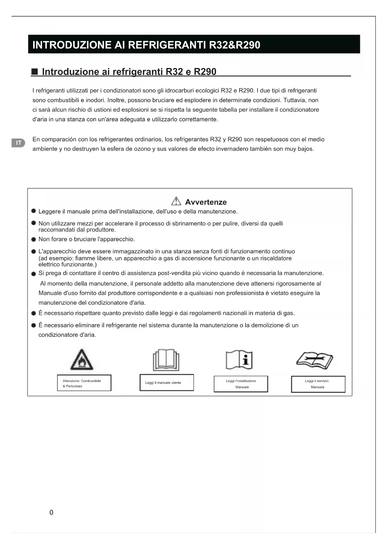 Introduzione ai refrigeranti R32 e R290 I refrigeranti utilizzati per i condizionatori sono gli idrocarburi ecologici R32 e R290. I due tipi di refrigeranti sono combustibili e inodori. Inoltre, possono bruciare ed esplodere in determinate condizioni. Tuttavia, non ci sarà alcun rischio di ustioni ed esplosioni se si rispetta la seguente tabella per installare il condizionatore d'aria in una stanza con un'area adeguata e utilizzarlo correttamente. En comparación con los refrigerantes ordinarios, los refrigerantes R32 y R290 son respetuosos con el medio ambiente y no destruyen la esfera de ozono y sus valores de efecto invernadero también son muy bajos. Avvertenze Leggere il manuale prima dell'installazione, dell'uso e della manutenzione. Non utilizzare mezzi per accelerare il processo di sbrinamento o per pulire, diversi da quelli raccomandati dal produttore. Non forare o bruciare l'apparecchio. L'apparecchio deve essere immagazzinato in una stanza senza fonti di funzionamento continuo (ad esempio: fiamme libere, un apparecchio a gas di accensione funzionante o un riscaldatore elettrico funzionante.) Si prega di contattare il centro di assistenza post-vendita più vicino quando è necessaria la manutenzione. Al momento della manutenzione, il personale addetto alla manutenzione deve attenersi rigorosamente al Manuale d'uso fornito dal produttore corrispondente e a qualsiasi non professionista è vietato eseguire la manutenzione del condizionatore d'aria. È necessario rispettare quanto previsto dalle leggi e dai regolamenti nazionali in materia di gas. È necessario eliminare il refrigerante nel sistema durante la manutenzione o la demolizione di un condizionatore d'aria. Attenzione: Combustibile & PericolosoLeggi il manuale utenteLeggi l'installazioneManualeLeggi il servizioManuale IIT!