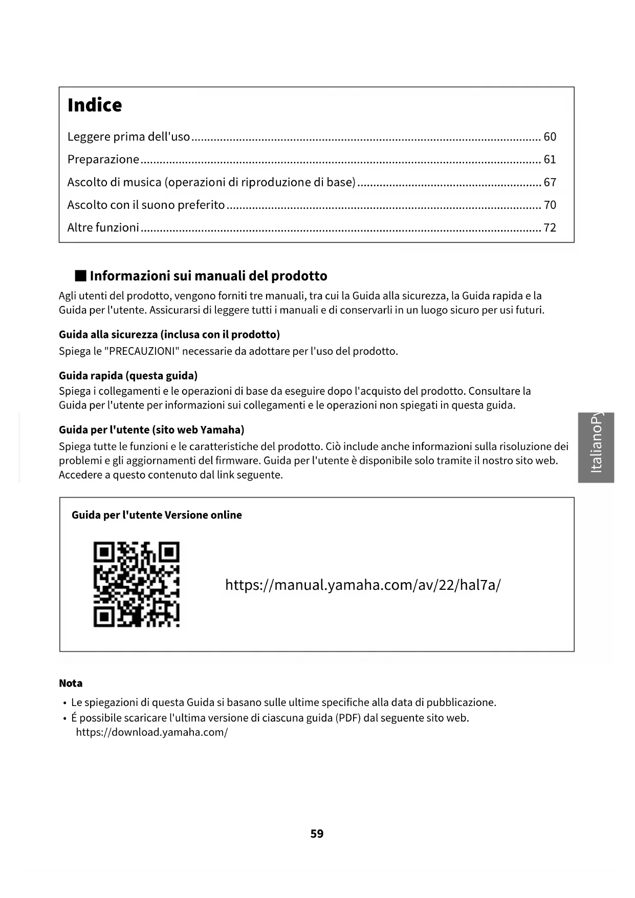 - Kontrollerar det fasta programmets version och initierar denna produkt Andra ämnen som inte anges ovan Funktion uppdatering av fast program Felsökning Specifikationer Användarhandbok Ställ in menylista 58■ Informazioni sui manuali del prodotto Agli utenti del prodotto, vengono forniti tre manuali, tra cui la Guida alla sicurezza, la Guida rapida e la Guida per l'utente. Assicurarsi di leggere tutti i manuali e di conservarli in un luogo sicuro per usi futuri. Guida alla sicurezza (inclusa con il prodotto) Spiega le "PRECAUZIONI" necessarie da adottare per l'uso del prodotto. Guida rapida (questa guida) Spiega i collegamenti e le operazioni di base da eseguire dopo l'acquisto del prodotto. Consultare la Guida per l'utente per informazioni sui collegamenti e le operazioni non spiegati in questa guida. Guida per l'utente (sito web Yamaha) Spiega tutte le funzioni e le caratteristiche del prodotto. Ciò include anche informazioni sulla risoluzione dei problemi e gli aggiornamenti del firmware. Guida per l'utente è disponibile solo tramite il nostro sito web. Accedere a questo contenuto dal link seguente. Guida per l'utente Versione online https://manual.yamaha.com/av/22/hal7a/ Nota