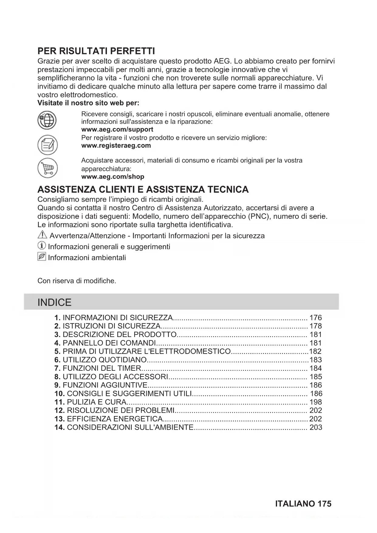 Grazie per aver scelto di acquistare questo prodotto AEG. Lo abbiamo creato per fornirvi prestazioni impeccabili per molti anni, grazie a tecnologie innovative che vi semplificheranno la vita - funzioni che non troverete sulle normali apparecchiature. Vi invitiamo di dedicare qualche minuto alla lettura per sapere come trarre il massimo dal vostro elettrodomestico. Visitate il nostro sito web per: Ricevere consigli, scaricare i nostri opuscoli, eliminare eventuali anomalie, ottenereinformazioni sull'assistenza e la riparazione:www.aeg.com/supportPer registrare il vostro prodotto e ricevere un servizio migliore:www.registeraeg.comAcquistare accessori, materiali di consumo e ricambi originali per la vostraapparecchiatura:www.aeg.com/shop