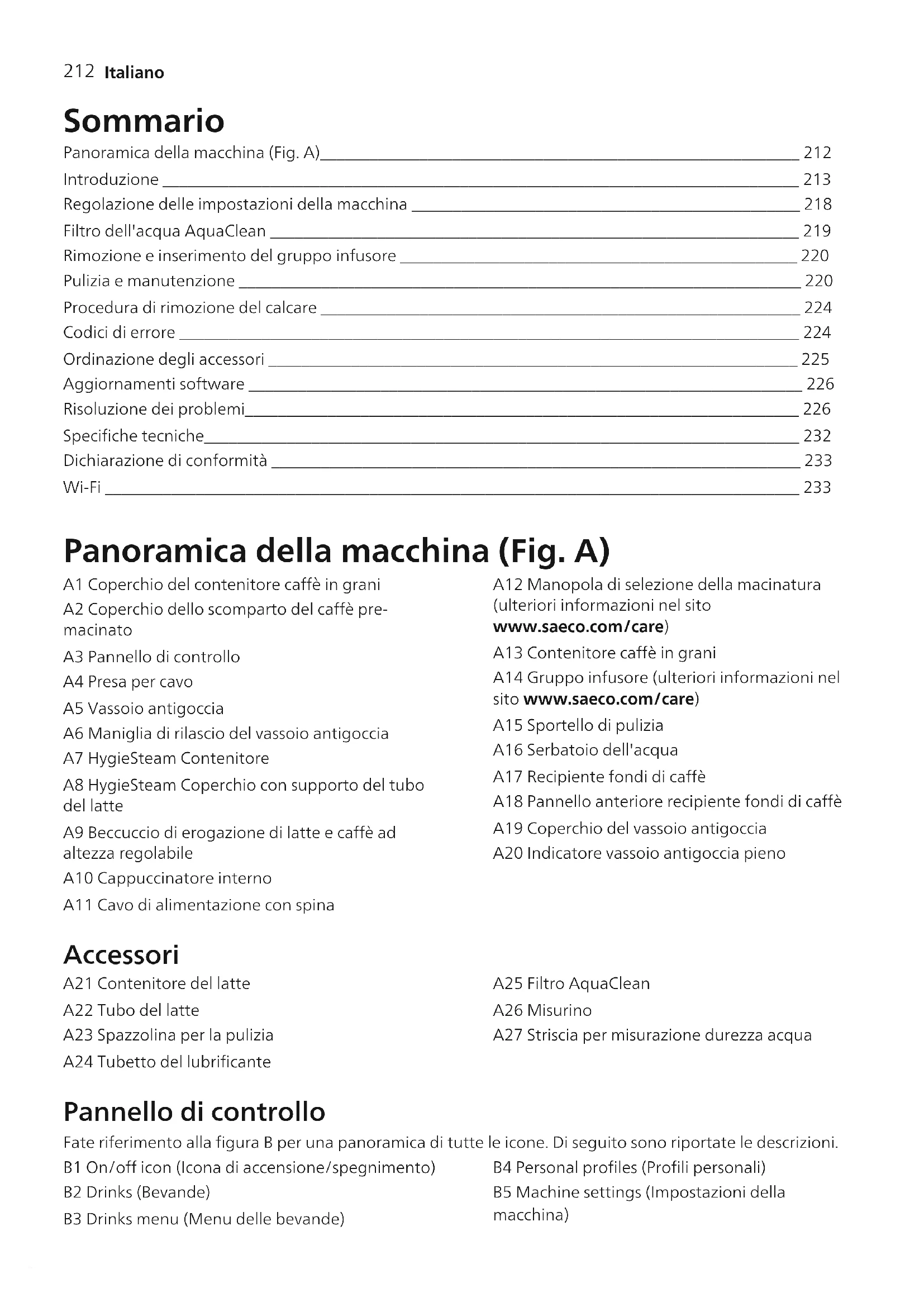 Italiano Sommario Panoramica della macchina (Fig. A)__________________________________________________________ 212 Introduzione _____________________________________________________________________________ 213 Regolazione delle impostazioni della macchina _______________________________________________ 218 Filtro dell'acqua AquaClean ________________________________________________________________ 219 Rimozione e inserimento del gruppo infusore ________________________________________________ 220 Pulizia e manutenzione ____________________________________________________________________ 220 Procedura di rimozione del calcare __________________________________________________________ 224 Codici di errore ___________________________________________________________________________ 224 Ordinazione degli accessori ________________________________________________________________ 225 Aggiornamenti software ___________________________________________________________________ 226 Risoluzione dei problemi___________________________________________________________________ 226 Specifiche tecniche________________________________________________________________________ 232 Dichiarazione di conformità ________________________________________________________________ 233 Wi-Fi ____________________________________________________________________________________ 233 Panoramica della macchina (Fig. A) A1 Coperchio del contenitore caffè in grani A2 Coperchio dello scomparto del caffè pre- macinato A3 Pannello di controllo A4 Presa per cavo A5 Vassoio antigoccia A6 Maniglia di rilascio del vassoio antigoccia A7 HygieSteam Contenitore A8 HygieSteam Coperchio con supporto del tubo del latte A9 Beccuccio di erogazione di latte e caffè ad altezza regolabile A10 Cappuccinatore interno A11 Cavo di alimentazione con spina A12 Manopola di selezione della macinatura (ulteriori informazioni nel sito www.saeco.com/care) A13 Contenitore caffè in grani A14 Gruppo infusore (ulteriori informazioni nel sito www.saeco.com/care) A15 Sportello di pulizia A16 Serbatoio dell'acqua A17 Recipiente fondi di caffè A18 Pannello anteriore recipiente fondi di caffè A19 Coperchio del vassoio antigoccia A20 Indicatore vassoio antigoccia pieno Accessori A21 Contenitore del latte A22 Tubo del latte A23 Spazzolina per la pulizia A24 Tubetto del lubrificante A25 Filtro AquaClean A26 Misurino A27 Striscia per misurazione durezza acqua Pannello di controllo Fate riferimento alla figura B per una panoramica di tutte le icone. Di seguito sono riportate le descrizioni. B1 On/off icon (Icona di accensione/spegnimento) B2 Drinks (Bevande) B3 Drinks menu (Menu delle bevande) B4 Personal profiles (Profili personali) B5 Machine settings (Impostazioni della macchina)213 Italiano B6 Status menu (Menu di stato) B7 Negozio B8 Start/stop icon (Icona di avvio/arresto) Introduzione Congratulazioni per l'acquisto della macchina per caffè superautomatica Saeco! Per trarre il massimo vantaggio dal supporto online offerto da Saeco, potete utilizzare il pannello di controllo per registrare la vostra macchina tramite la connessione Wi-Fi integrata oppure accedere al sito www.saeco.com/MyCoffeeMachine e registrare lì il vostro prodotto. Prima di utilizzare la macchina per la prima volta, leggete attentamente l'opuscolo sulla sicurezza fornito a parte e conservatelo per eventuali riferimenti futuri. La macchina da caffè Saeco completamente automatica vi consente di connettervi alla vostra rete Wi-Fi per godere di un'esperienza migliore. Connettendo la macchina alla vostra rete Wi-Fi, sarete in grado di: