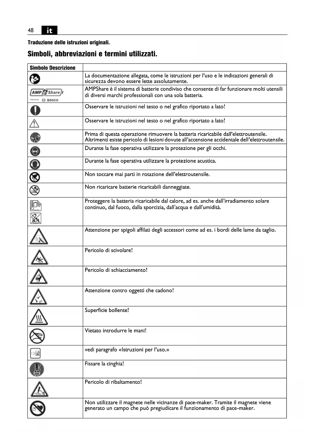 Traduzione delle istruzioni originali. Simboli, abbreviazioni e termini utilizzati. Simbolo Descrizione La documentazione allegata, come le istruzioni per l’uso e le indicazioni generali di sicurezza devono essere lette assolutamente. AMPShare è il sistema di batterie condiviso che consente di far funzionare molti utensili di diversi marchi professionali con una sola batteria. Osservare le istruzioni nel testo o nel grafico riportato a lato! Osservare le istruzioni nel testo o nel grafico riportato a lato! Prima di questa operazione rimuovere la batteria ricaricabile dall’elettroutensile. Altrimenti esiste pericolo di lesioni dovute all’accensione accidentale dell’elettroutensile. Durante la fase operativa utilizzare la protezione per gli occhi. Durante la fase operativa utilizzare la protezione acustica. Non toccare mai parti in rotazione dell’elettroutensile. Non ricaricare batterie ricaricabili danneggiate. Proteggere la batteria ricaricabile dal calore, ad es. anche dall'irradiamento solare continuo, dal fuoco, dalla sporcizia, dall'acqua e dall'umidità. Attenzione per spigoli affilati degli accessori come ad es. i bordi delle lame da taglio. Pericolo di scivolare! Pericolo di schiacciamento! Attenzione contro oggetti che cadono! Superficie bollente! Vietato introdurre le mani! vedi paragrafo «Istruzioni per l’uso.» Fissare la cinghia! Pericolo di ribaltamento! Non utilizzare il magnete nelle vicinanze di pace-maker. Tramite il magnete viene generato un campo che può pregiudicare il funzionamento di pace-maker. max.50°C49