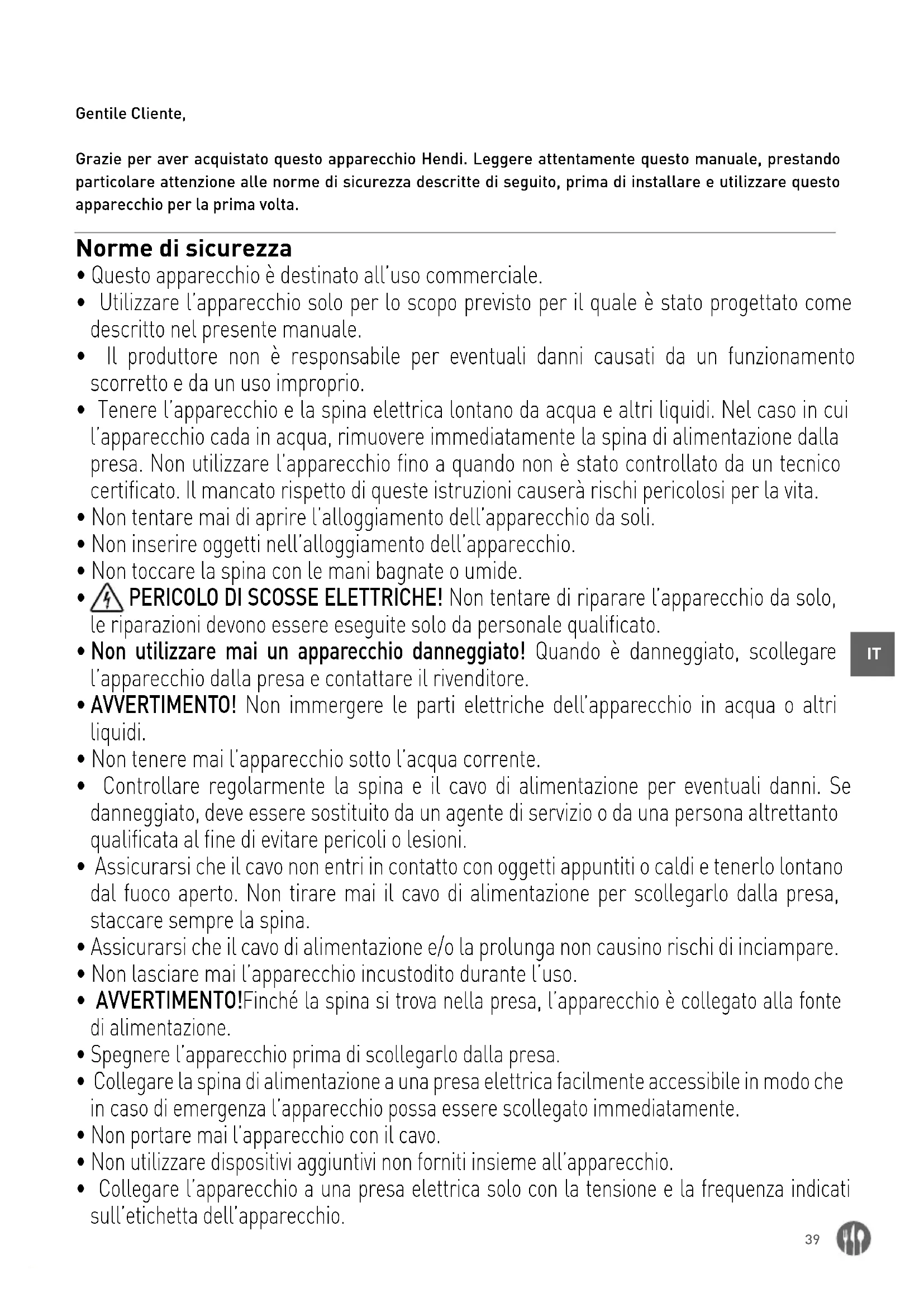 Gentile Cliente, Grazie per aver acquistato questo apparecchio Hendi. Leggere attentamente questo manuale, prestando particolare attenzione alle norme di sicurezza descritte di seguito, prima di installare e utilizzare questo apparecchio per la prima volta. Norme di sicurezza