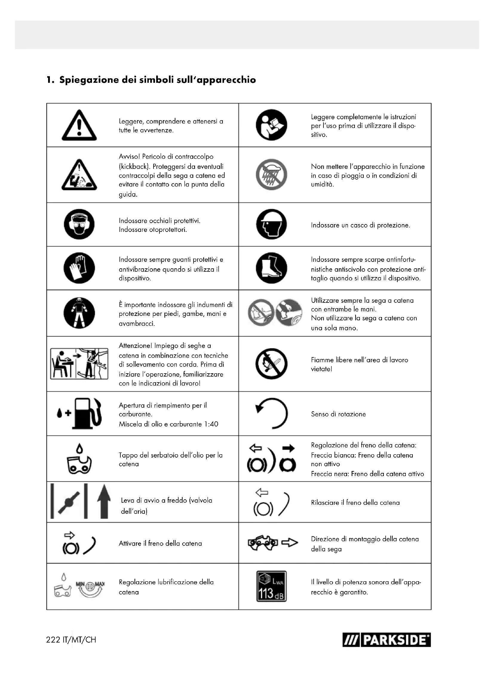 Leggere, comprendere e attenersi a tutte le avvertenze. Leggere completamente le istruzioni per l‘uso prima di utilizzare il dispo- sitivo. Avviso! Pericolo di contraccolpo (kickback). Proteggersi da eventuali contraccolpi della sega a catena ed evitare il contatto con la punta della guida. Non mettere l‘apparecchio in funzione in caso di pioggia o in condizioni di umidità. Indossare occhiali protettivi. Indossare otoprotettori. Indossare un casco di protezione. Indossare sempre guanti protettivi e antivibrazione quando si utilizza il dispositivo. Indossare sempre scarpe antinfortu- nistiche antiscivolo con protezione anti- taglio quando si utilizza il dispositivo. È importante indossare gli indumenti di protezione per piedi, gambe, mani e avambracci. Utilizzare sempre la sega a catena con entrambe le mani. Non utilizzare la sega a catena con una sola mano. Attenzione! Impiego di seghe a catena in combinazione con tecniche di sollevamento con corda. Prima di iniziare l‘operazione, familiarizzare con le indicazioni di lavoro! Fiamme libere nell‘area di lavoro vietate! Apertura di riempimento per il carburante. Miscela di olio e carburante 1:40 Senso di rotazione Tappo del serbatoio dell’olio per la catena Regolazione del freno della catena: Freccia bianca: Freno della catena non attivo Freccia nera: Freno della catena attivo Leva di avvio a freddo (valvola dell‘aria) Rilasciare il freno della catena Attivare il freno della catena Direzione di montaggio della catena della sega Regolazione lubrificazione della catena Il livello di potenza sonora dell‘appa- recchio è garantito.223IT/MT/CH Attenzione! Parti calde. push primer 6 times Premere 6 volte la pompa del carbu- rante (Primer). Direzione di marcia della catena PERICOLO Dicitura di segnalazione indicante la presenza di una situazione imminente di pericolo che, se non viene evitata, porta alla morte o a gravi lesioni. AVVISO Dicitura di segnalazione indicante una possibile situazione di pericolo che, se non viene evitata, può portare alla morte o a gravi lesioni. CAUTELA Dicitura di segnalazione indicante una possibile situazione di pericolo che, se non viene evitata, può comportare lesioni di lieve o media entità. AVVERTENZA Dicitura di segnalazione indicante una possibile situazione di pericolo che, se non viene evitata, potreb- be comportare danni materiali al prodotto o proprietà.