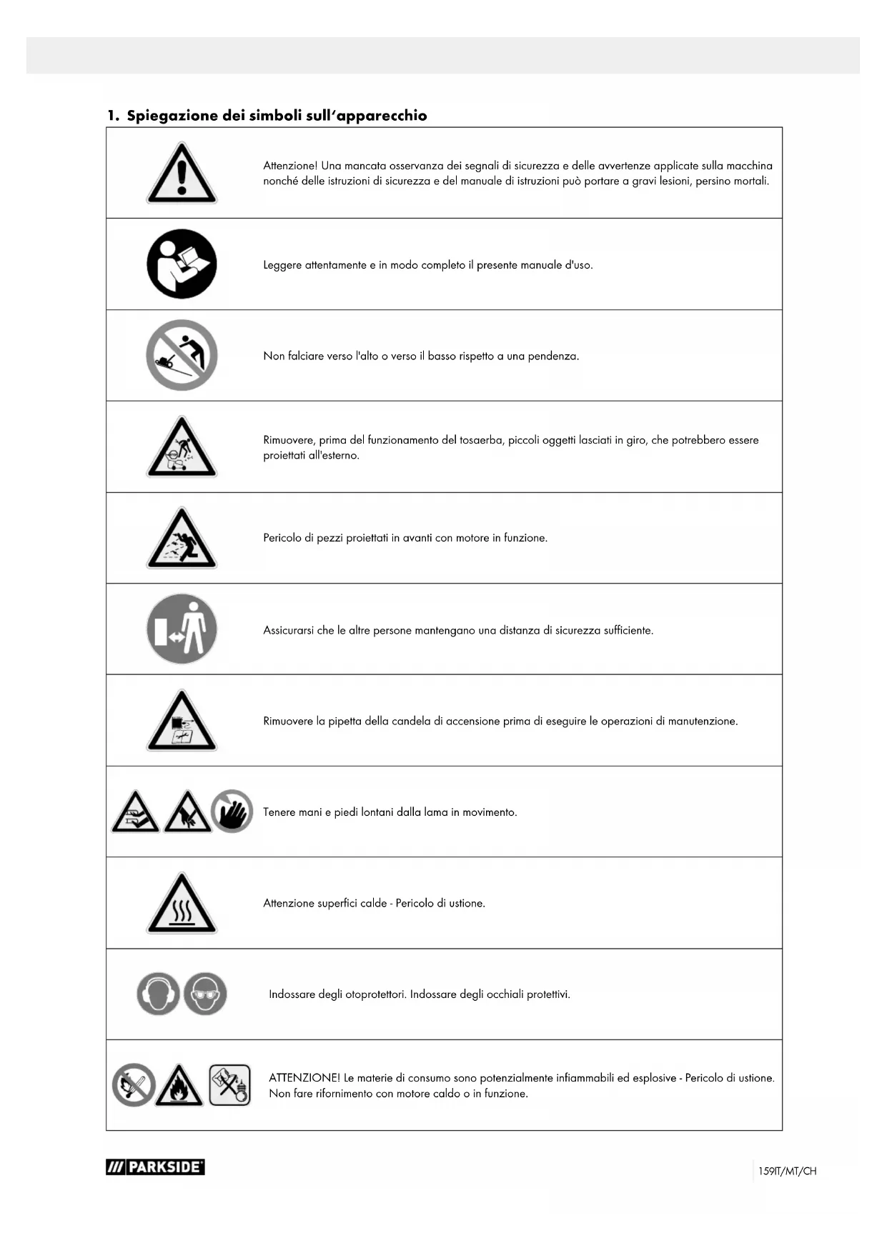 Premere 3 volte la pompa del carburante "Primer". Lunghezza lama. Max. larghezza di taglio. Livello di potenza acustica garantito. Il prodotto è conforme alle direttive europee in vigore. MIN MAX Controllare il livello dell'olio. STOP MOTORDRIVE DRIVE - Staffa trazione STOP - Leva del freno motore Pericolo di intossicazione! Utilizzare l'apparecchio solo in ambienti esterni e mai in locali chiusi o scarsa- mente ventilati. m Attenzione! Nel presente manuale di istruzioni i punti riguardanti la sicurezza sono contrassegnati dal seguente simbolo. PERICOLO! Dicitura di segnalazione indicante la presenza di una situazione imminente di pericolo che, se non viene evitata, porta alla morte o a gravi lesioni.161IT/MT/CH AVVISO! Dicitura di segnalazione indicante una possibile situazione di pericolo che, se non viene evitata, può portare alla morte o a gravi lesioni. CAUTELA! Dicitura di segnalazione indicante una possibile situazione di pericolo che, se non viene evitata, può comportare lesioni di lieve o media entità. AVVERTENZA Dicitura di segnalazione indicante una possibile situazione di pericolo che, se non viene evitata, potrebbe comportare danni materiali al prodotto o proprietà.162 IT/MT/CH