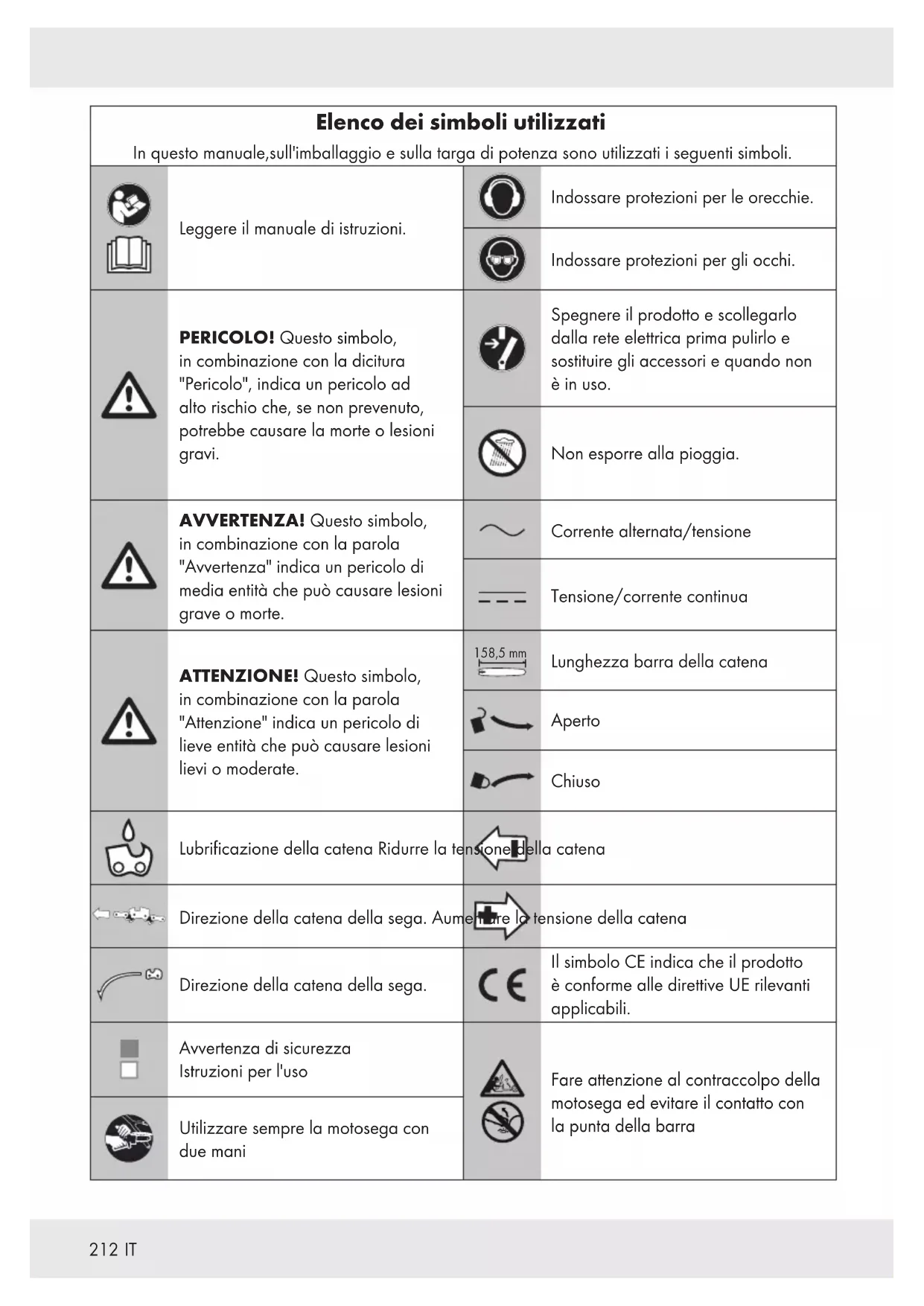 Elenco dei simboli utilizzati In questo manuale,sull'imballaggio e sulla targa di potenza sono utilizzati i seguenti simboli. Leggere il manuale di istruzioni. Indossare protezioni per le orecchie. Indossare protezioni per gli occhi. PERICOLO! Questo simbolo, in combinazione con la dicitura "Pericolo", indica un pericolo ad alto rischio che, se non prevenuto, potrebbe causare la morte o lesioni gravi. Spegnere il prodotto e scollegarlo dalla rete elettrica prima pulirlo e sostituire gli accessori e quando non è in uso. Non esporre alla pioggia. AVVERTENZA! Questo simbolo, in combinazione con la parola "Avvertenza" indica un pericolo di media entità che può causare lesioni grave o morte. Corrente alternata/tensione Tensione/corrente continua ATTENZIONE! Questo simbolo, in combinazione con la parola "Attenzione" indica un pericolo di lieve entità che può causare lesioni lievi o moderate. 158,5 mm Lunghezza barra della catena Aperto Chiuso Lubrificazione della catena Ridurre la tensione della catena Direzione della catena della sega. Aumentare la tensione della catena Direzione della catena della sega. Il simbolo CE indica che il prodotto è conforme alle direttive UE rilevanti applicabili. Avvertenza di sicurezza Istruzioni per l'uso Fare attenzione al contraccolpo della motosega ed evitare il contatto con la punta della barra Utilizzare sempre la motosega con due mani213