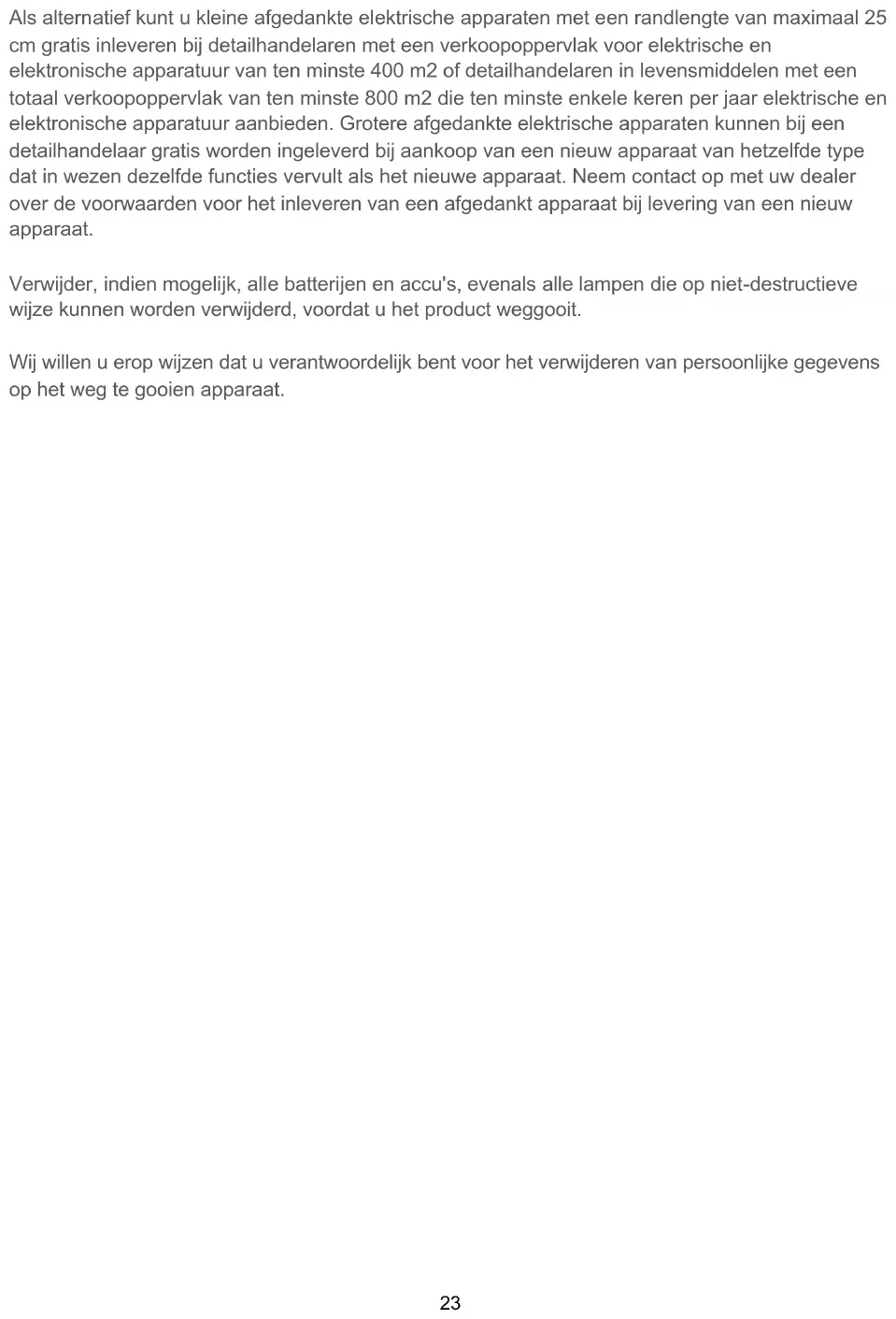 Il simbolo del cassonetto barrato sul prodotto o sulla confezione significa che l'apparecchio non deve essere smaltito insieme ai rifiuti domestici, ma deve essere smaltito separatamente. È possibile portare gratuitamente il vecchio apparecchio presso un punto di raccolta comunale adatto per i rifiuti di apparecchiature elettriche ed elettroniche, ad esempio un centro di riciclaggio. Gli indirizzi sono disponibili presso la propria città o amministrazione comunale.23 In alternativa, è possibile restituire gratuitamente i RAEE di piccole dimensioni con bordi di lunghezza non superiore a 25 cm ai rivenditori con una superficie di vendita di apparecchiature elettriche ed elettroniche di almeno 400 m2 o ai rivenditori di generi alimentari con una superficie di vendita totale di almeno 800 m2 che più volte all’anno offrono apparecchiature elettriche ed elettroniche. I RAEE di grandi dimensioni possono essere restituiti gratuitamente al momento dell'acquisto di un nuovo apparecchio dello stesso tipo che svolga essenzialmente le stesse funzioni del nuovo apparecchio presso un rivenditore appropriato. Contattare il proprio rivenditore per conoscere le modalità di restituzione di un vecchio apparecchio in caso di consegna del nuovo apparecchio. Prima di smaltire il prodotto, rimuovere, se possibile, tutte le batterie e gli accumulatori, nonché tutte le lampade che possono essere rimosse in modo non distruttivo. Ricordiamo che l’utente è responsabile della cancellazione dei dati personali sull'apparecchio da smaltire.1 INDHOLDSFORTEGNELSE