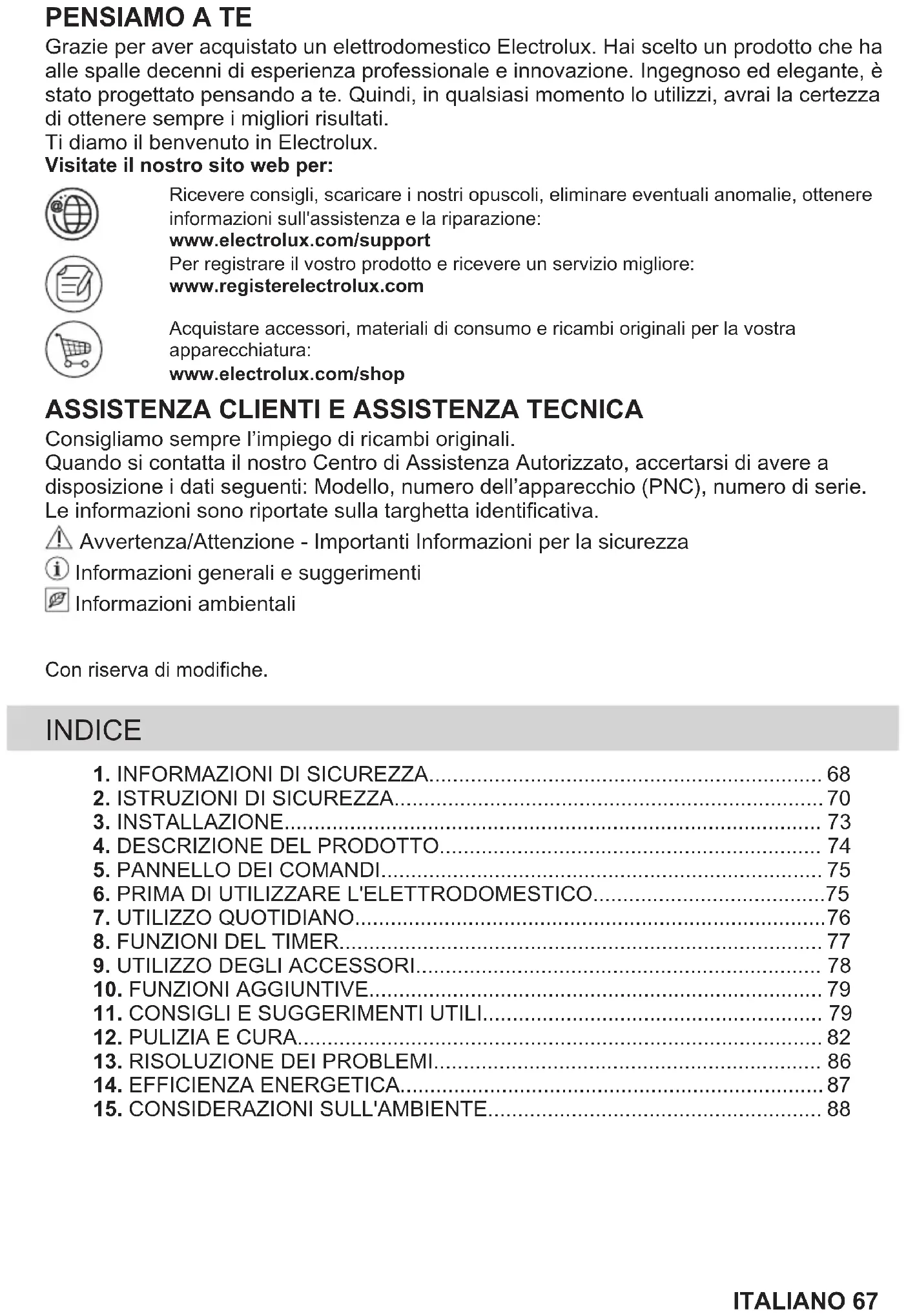 Consigliamo sempre l’impiego di ricambi originali. Quando si contatta il nostro Centro di Assistenza Autorizzato, accertarsi di avere a disposizione i dati seguenti: Modello, numero dell’apparecchio (PNC), numero di serie. Le informazioni sono riportate sulla targhetta identificativa. Avvertenza/Attenzione - Importanti Informazioni per la sicurezza Informazioni generali e suggerimenti Informazioni ambientali Con riserva di modifiche. INDICE