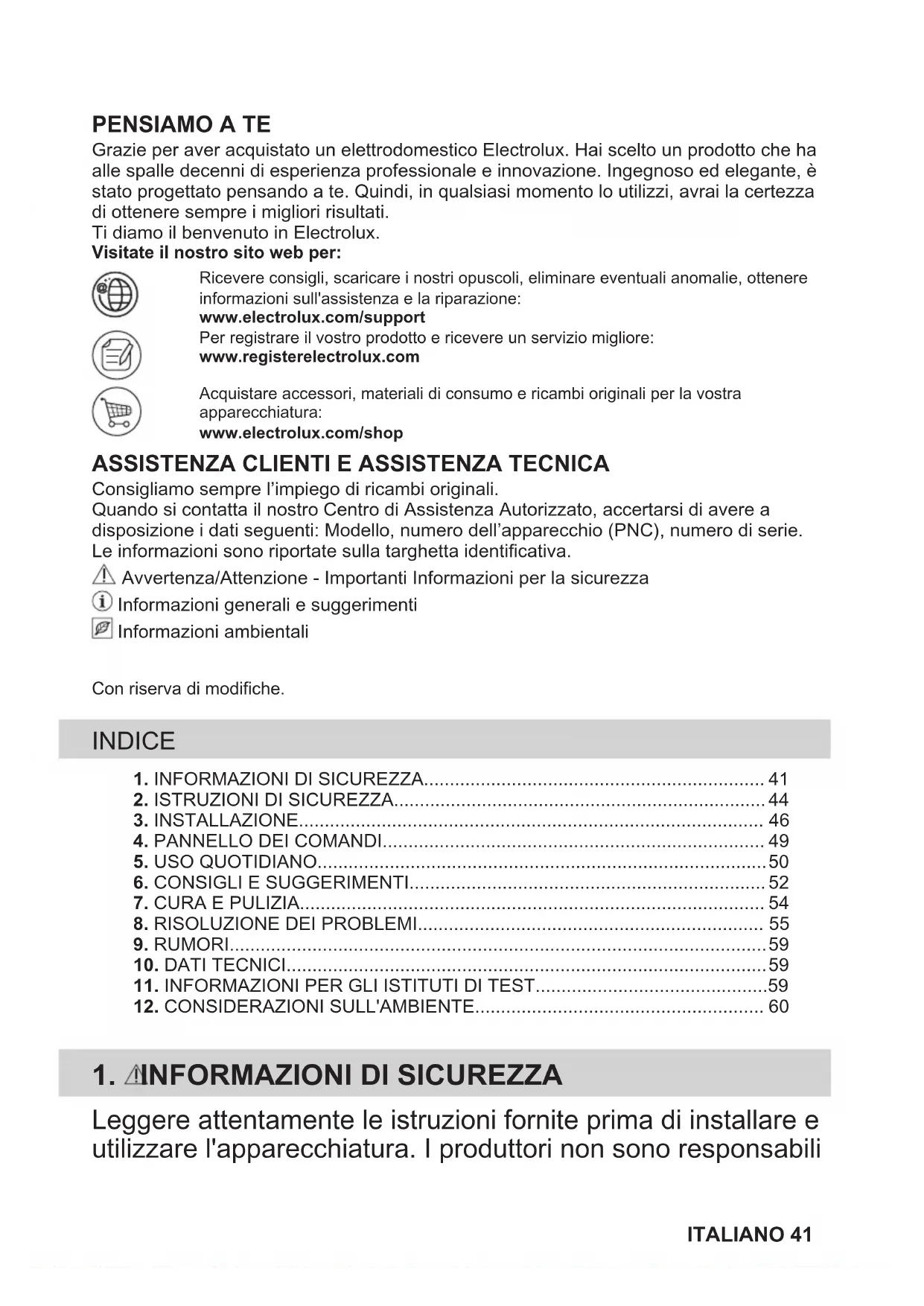 Grazie per aver acquistato un elettrodomestico Electrolux. Hai scelto un prodotto che haalle spalle decenni di esperienza professionale e innovazione. Ingegnoso ed elegante, èstato progettato pensando a te. Quindi, in qualsiasi momento lo utilizzi, avrai la certezzadi ottenere sempre i migliori risultati.Ti diamo il benvenuto in Electrolux.Visitate il nostro sito web per:Ricevere consigli, scaricare i nostri opuscoli, eliminare eventuali anomalie, ottenereinformazioni sull'assistenza e la riparazione:www.electrolux.com/supportPer registrare il vostro prodotto e ricevere un servizio migliore:www.registerelectrolux.comAcquistare accessori, materiali di consumo e ricambi originali per la vostraapparecchiatura:www.electrolux.com/shop