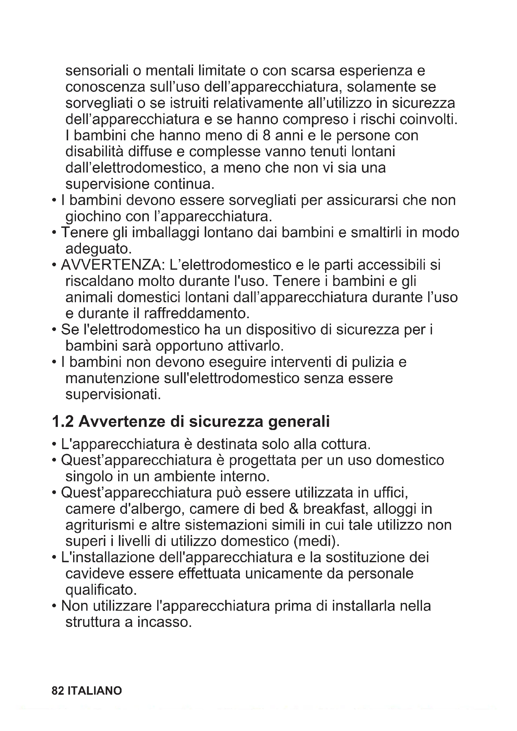 - Quest’apparecchiatura può essere usata da bambini a partire da 8 anni di età e da adulti con capacità fisiche, ITALIANO 81sensoriali o mentali limitate o con scarsa esperienza e conoscenza sull’uso dell’apparecchiatura, solamente se sorvegliati o se istruiti relativamente all’utilizzo in sicurezza dell’apparecchiatura e se hanno compreso i rischi coinvolti. I bambini che hanno meno di 8 anni e le persone con disabilità diffuse e complesse vanno tenuti lontani dall’elettrodomestico, a meno che non vi sia una supervisione continua.
