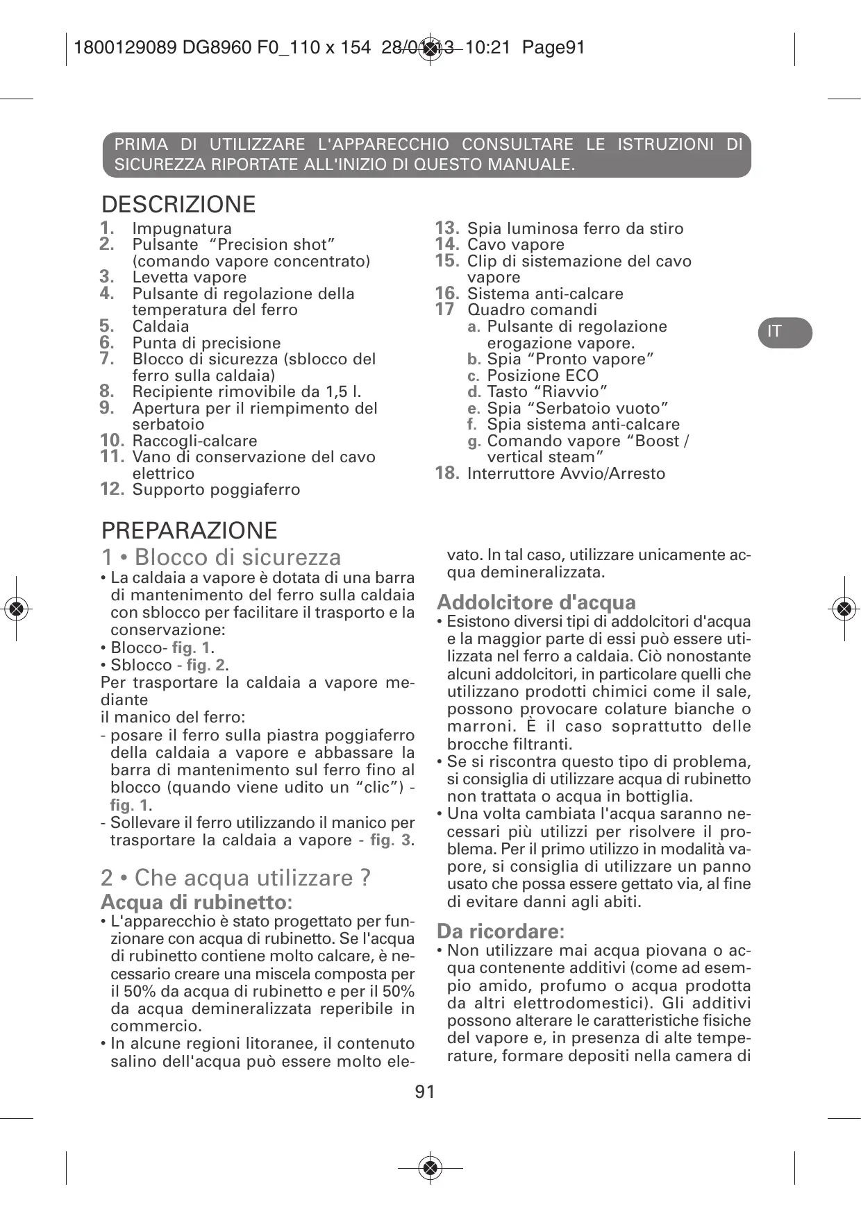 - Sblocco - fig. 2. Per trasportare la caldaia a vapore mediante il manico del ferro: - posare il ferro sulla piastra poggiaferro della caldaia a vapore e abbassare la barra di mantenimento sul ferro fino al blocco (quando viene udito un “clic”) fig. 1. - Sollevare il ferro utilizzando il manico per trasportare la caldaia a vapore - fig. 3. 2 • Che acqua utilizzare ? Acqua di rubinetto: