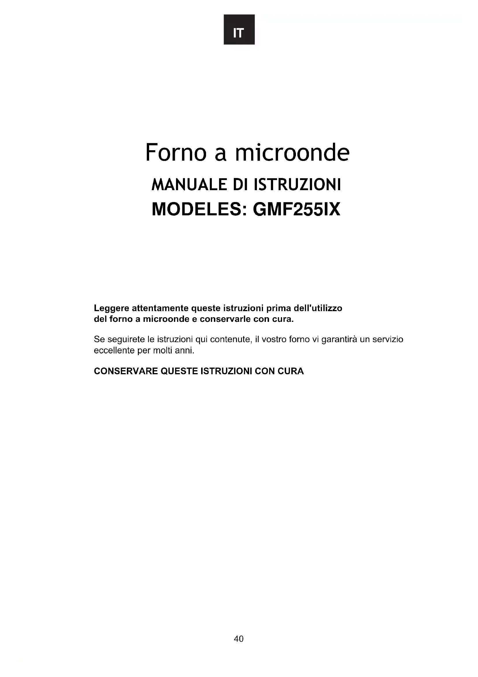 Leggere attentamente queste istruzioni prima dell'utilizzo del forno a microonde e conservarle con cura. Se seguirete le istruzioni qui contenute, il vostro forno vi garantirà un servizio eccellente per molti anni.